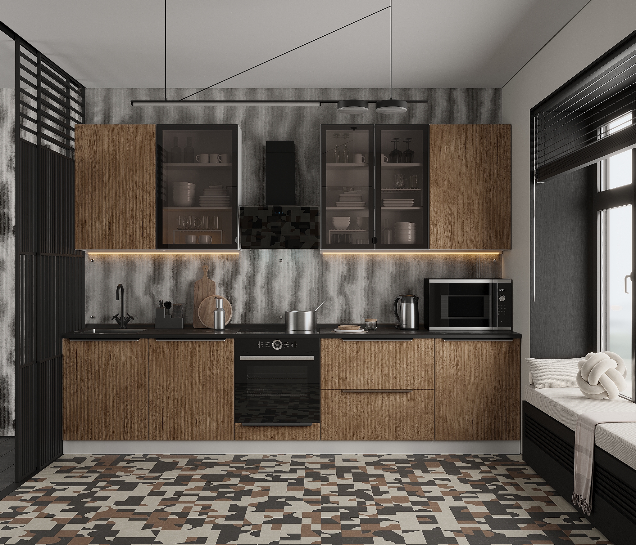 Современный дизайн: Эстетика и текстура рифленых фасадов придают кухне оригинальный вид, создавая игру света и тени. Это не только красиво, но и практично — такие поверхности легче чистить и они менее подвержены появлению царапин.