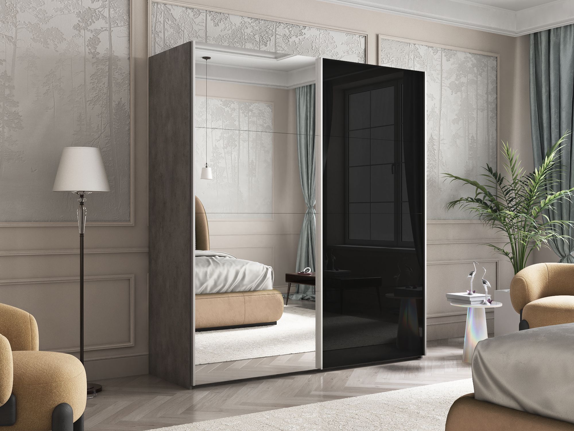 Шкаф Эста дуо Стекло черное/зеркало 2400 х 1600 х 660 (Бетон серый)