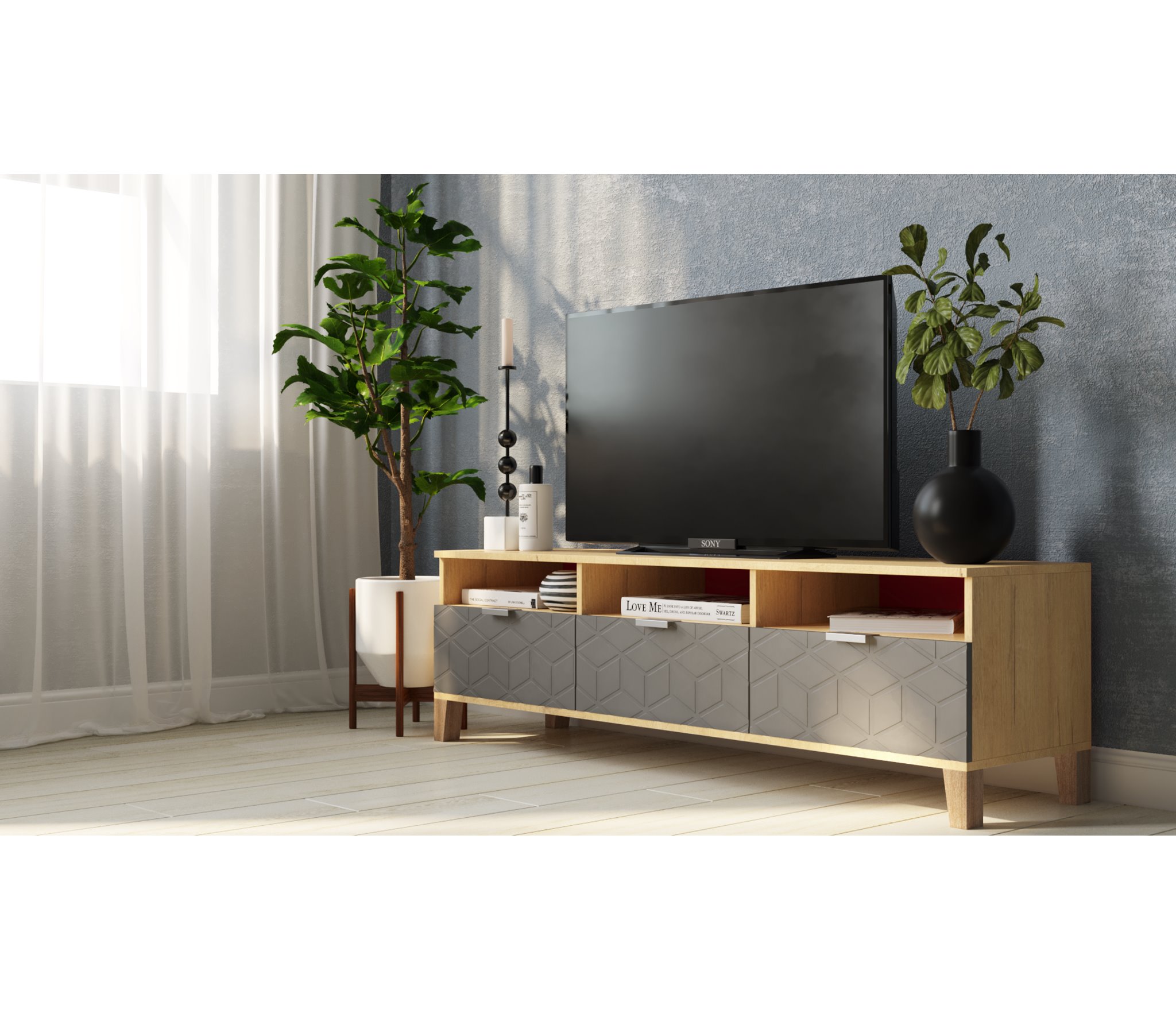 Тумба под ТВ Марвин, выполненные в скандинавском стиле, органично дополнят интерьер любой комнаты. Ножки из массива бука, геометрическая фрезеровка на фасадах, сочетание цветов отличительная черта серии комодов Марвин.