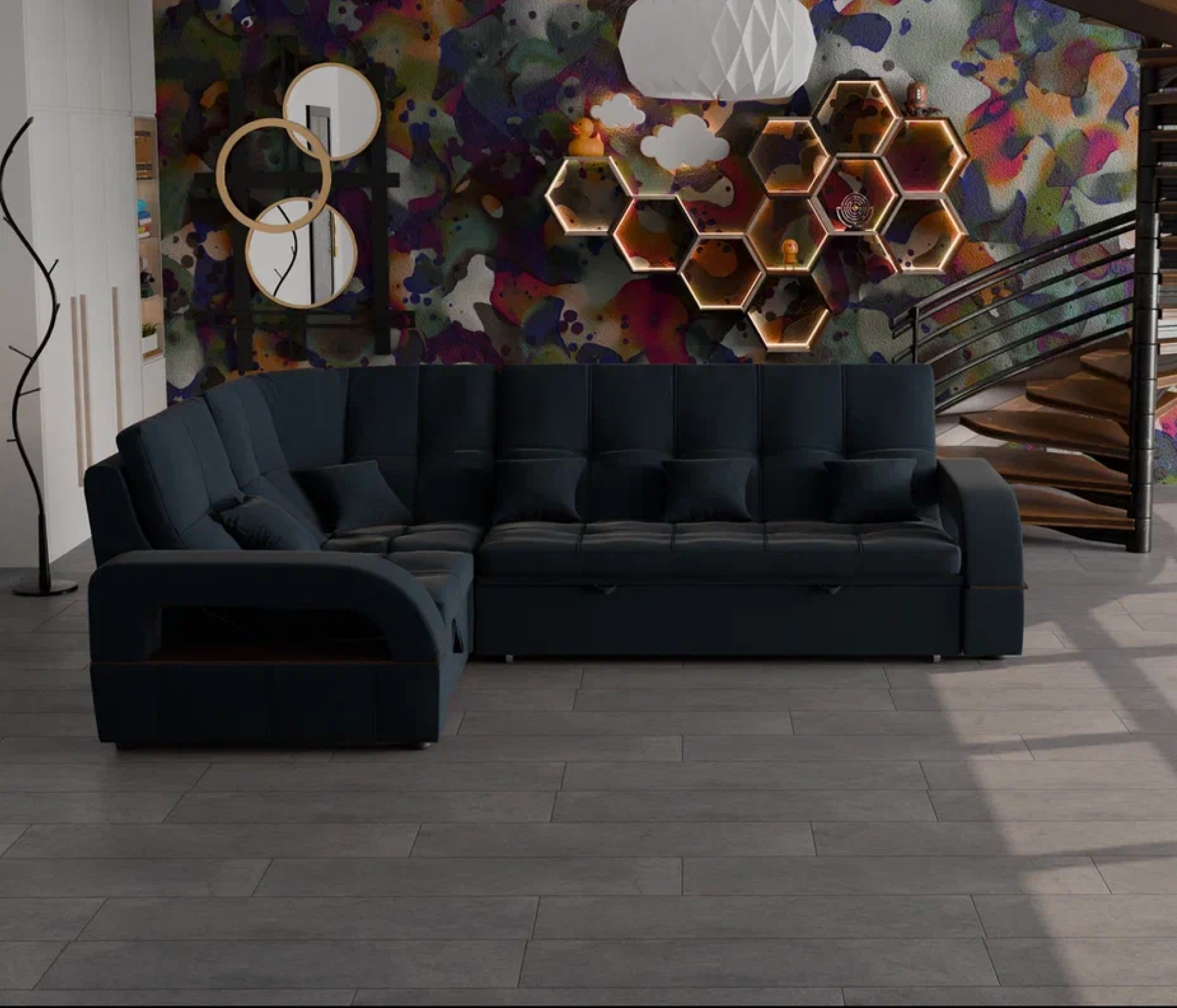 Он имеет высоту 97 см, ширину 187 см и глубину 268 см. Диван обладает универсальным расположением угла, что позволяет его использовать в любом помещении.
