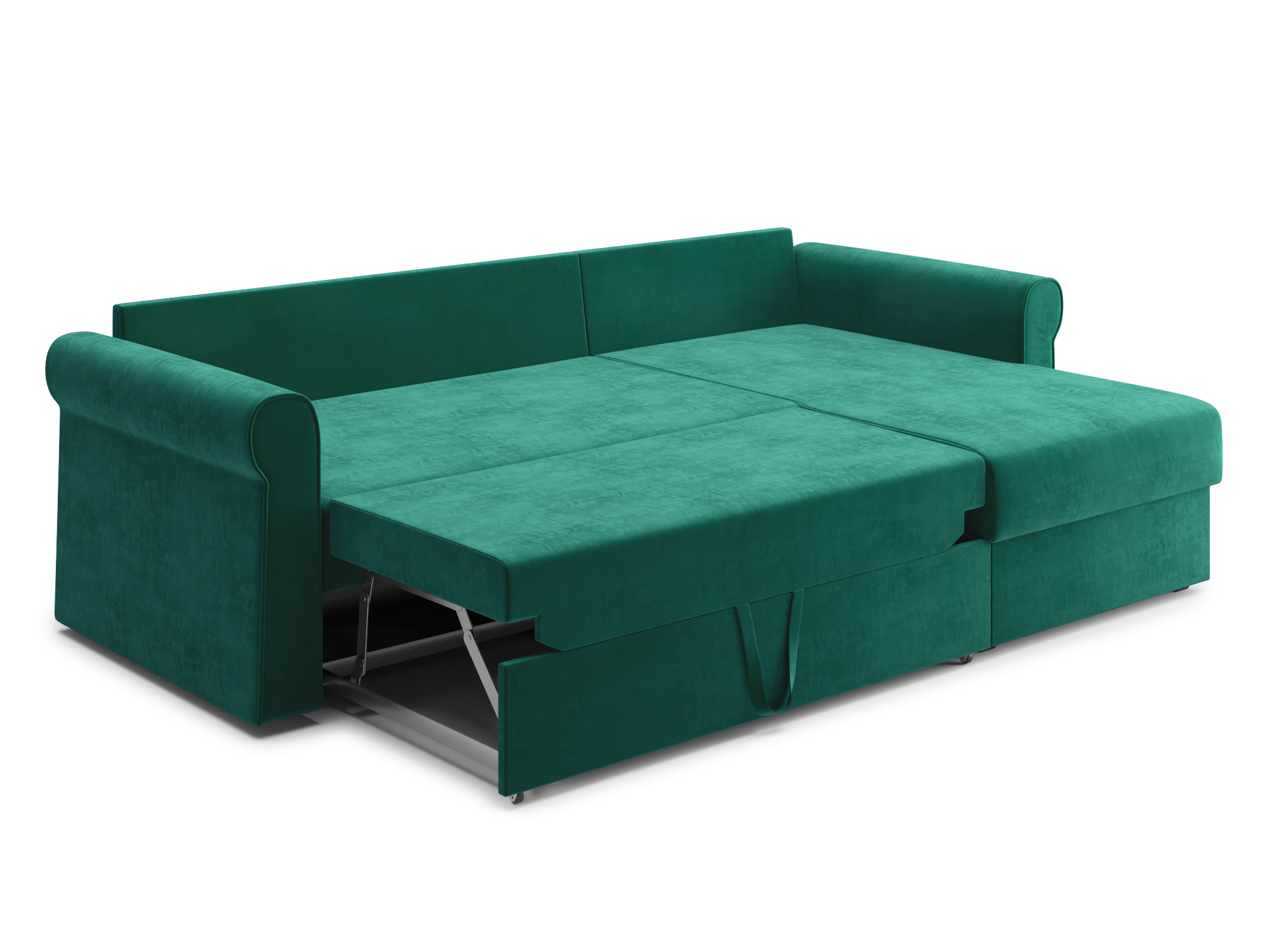 - Механизм раскладки дельфин — основан на выкатывании дополнительной платформы, скрытой под сидением дивана. Чтобы разложить диван, нужно потянуть за специальные ремешки, помогающие перемещать элементы конструкции. В результате этого действия нижняя часть дивана начнёт перемещаться. Делать это нужно до тех пор, пока часть не выдвинется максимально вперед. Затем следует немного приподнять элемент и упереть в противоположную часть, которая осталась неподвижной. Под сиденьем дивана находится короб для хранения вещей и постельных принадлежностей.