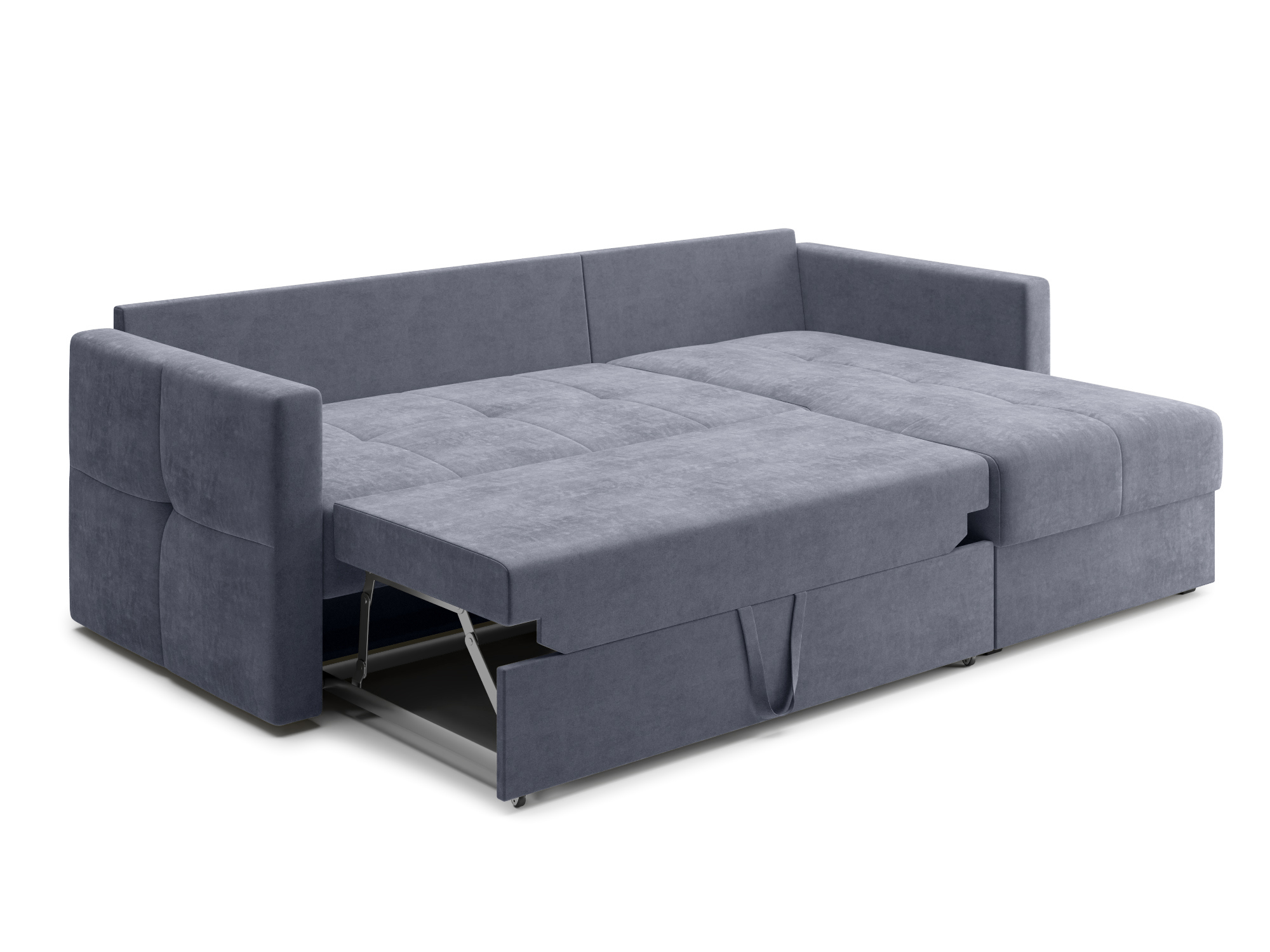 - Механизм раскладки дельфин – основан на выкатывании дополнительной платформы, скрытой под сидением дивана. Чтобы разложить диван, нужно потянуть за специальные ремешки, помогающие перемещать элементы конструкции. В результате этого действия нижняя часть дивана начнёт перемещаться. Делать это нужно до тех пор, пока часть не выдвинется максимально вперед. Затем следует немного приподнять элемент и упереть в противоположную часть, которая осталась неподвижной. Под сиденьем дивана находится короб для хранения вещей и постельных принадлежностей.