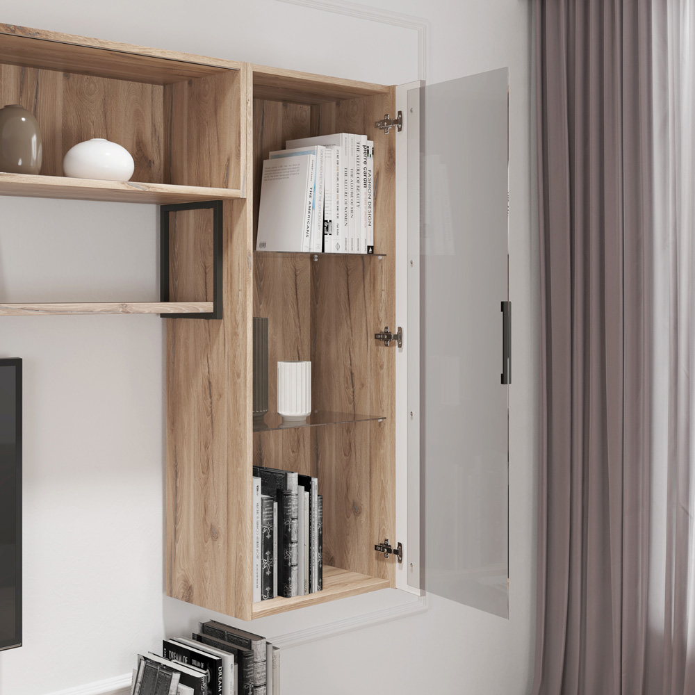 Шкаф имеет один распашной фасад выполненный из МДФ облицованного пленкой в цвете ясень грей софт и стекла серого с обработкой по периметру.