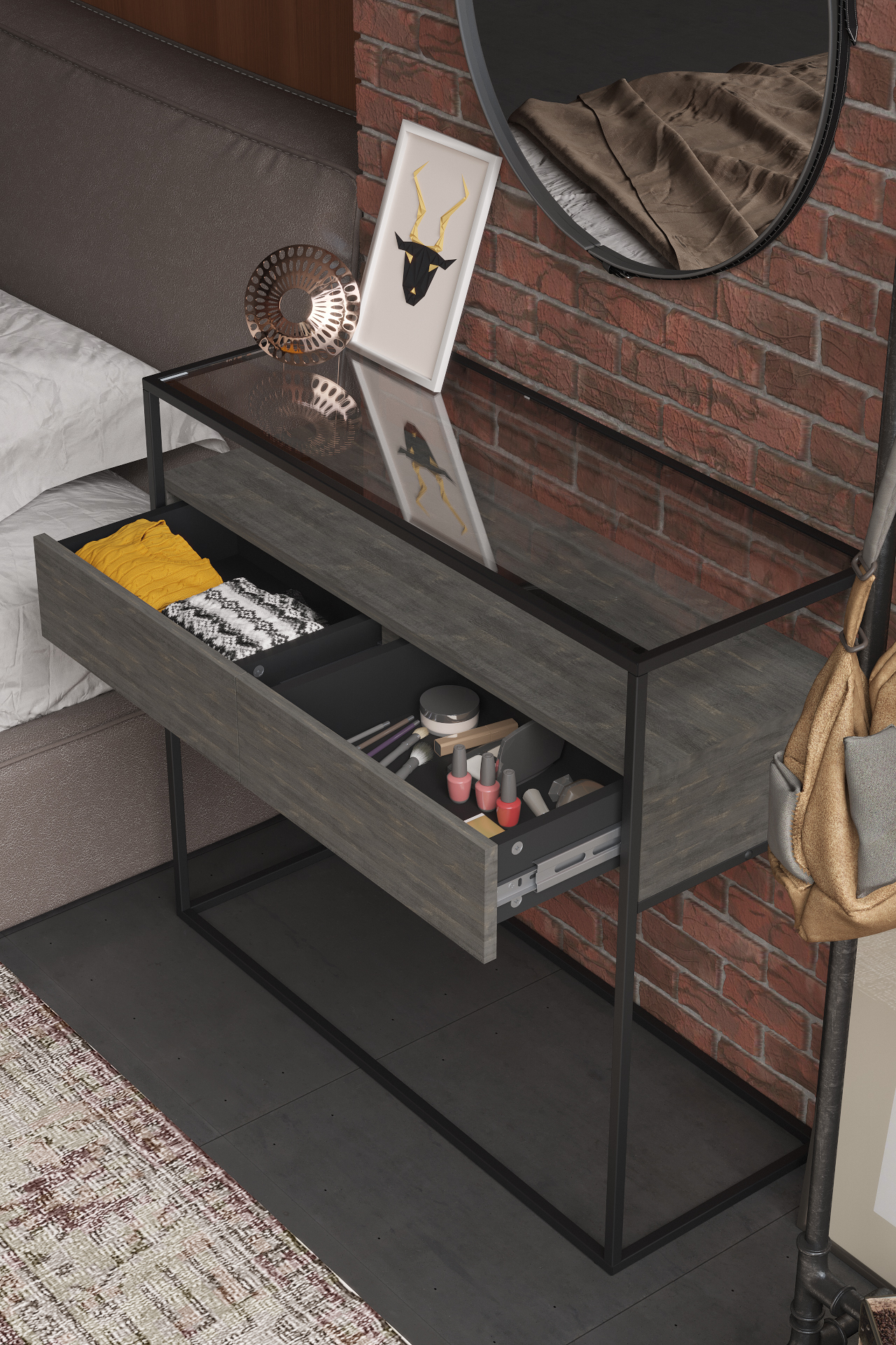 Консоль «Эйден» выполнена в современном лаконичном стиле и уместно дополнит интерьер спальной комнаты или прихожей. Стильная консоль приковывает внимание прежде всего своим исполнением: комбинацией используемых материалов. Стеклянная столешница из тонированного закаленного стекла в сером цвете дополнена полкой и ящиками для удобного хранения подручных вещей с системой открывания PUSH-TO-OPEN. А прочный металлический профиль толщиной 15 мм обеспечивает высокую прочность и устойчивость. Цветовое решение консоли можно выбрать из вариантов предложенных нашей фабрикой. Дизайнерский прием - возможность комбинировать с другими предметами интерьера из серии "Эйден", позволяя воссоздать атмосферу истинного комфорта и удобства.