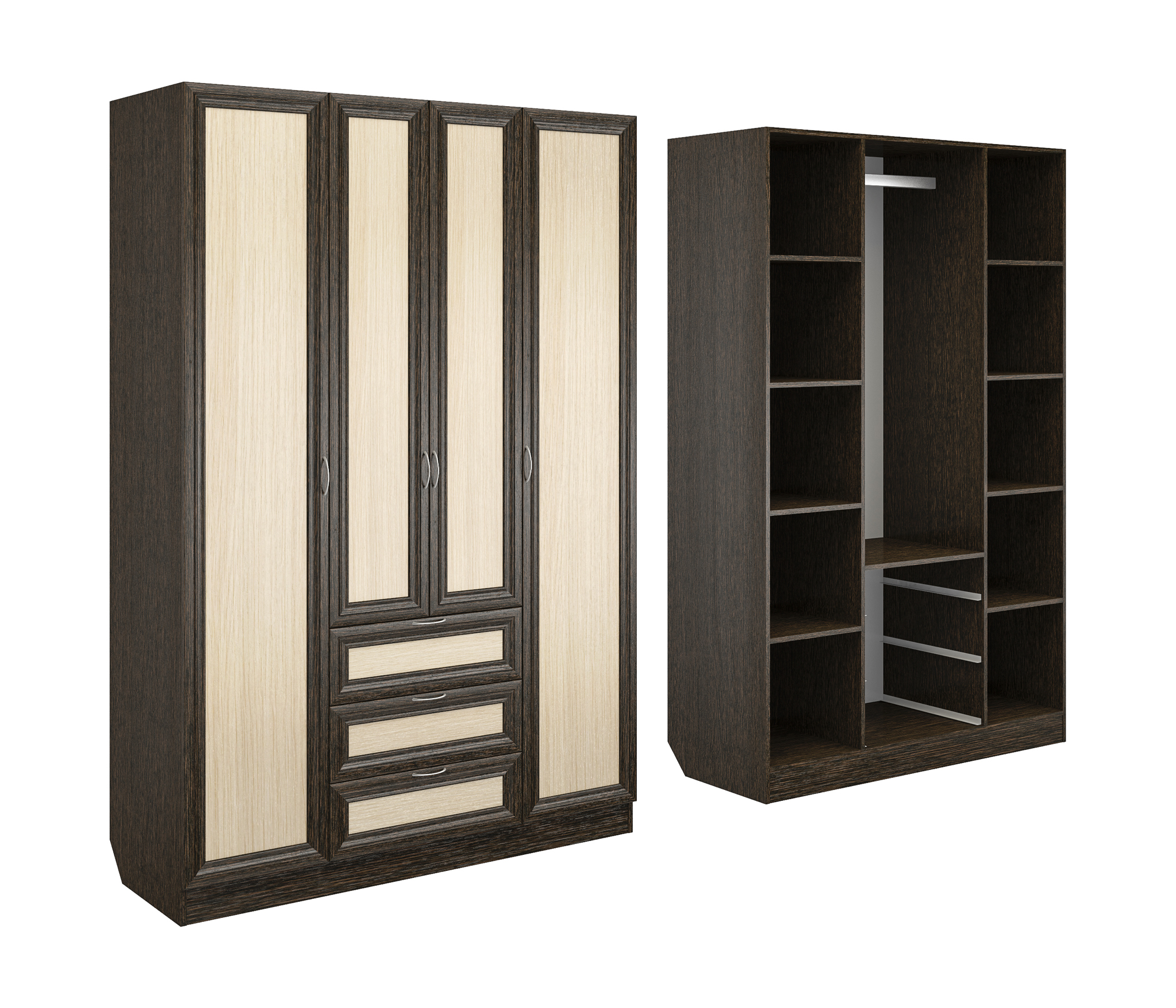 Корпус шкафа выполнен из Ламинированной ДСП высокого качества с насыщенным цветом. Фасады выполнены из материала МДФ.Шириною 140 см., красивый, удобный и очень функциональный четырехстворчатый шкаф. По краям слева и справа секции по четыре полки в каждой. В центре сверху узкая ниша, под ней большая секция со штангой для одежды. В самом низу встроены три выдвижных ящика.