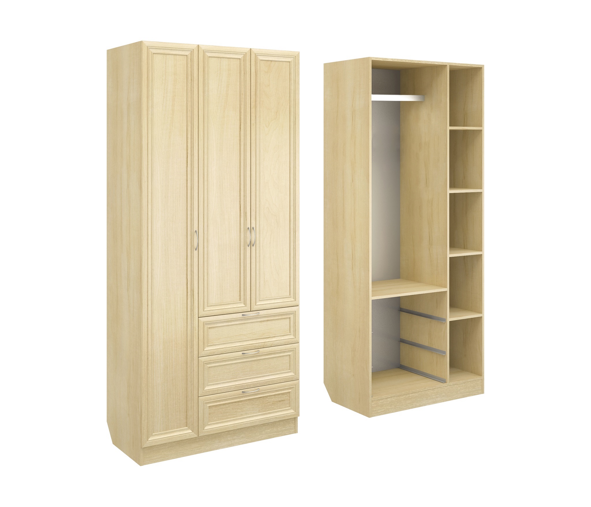 Корпус шкафа выполнен из Ламинированной ДСП высокого качества с насыщенным цветом. Фасады выполнены из материала МДФ.Шириною 90 см., это большая и функциональная модель типа Шкаф-Комод. Наполнение шкафа представлено в следующем виде: Слева за длинной дверцей пять кубических ниш. Справа сверху вниз, небольшая ниша, секция со штангой для одежды и три выдвижных ящика.