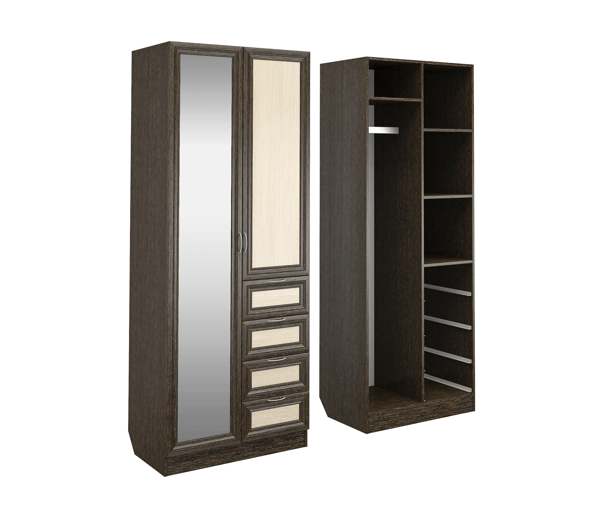 Корпус шкафа выполнен из Ламинированной ДСП высшего качества с насыщенным цветом. Фасады выполнены из материала МДФ.Ширина шкафа 80 см., эта многофункциональная модель несет в себе следующие элементы. Слева за распашной дверью с зеркалом располагается штанга для одежды, вверху ниша. Справа за дверью три ниши, а внизу четыре выдвижных ящика как у комода.В данной моделе установлено зеркало, которое монтируется на производстве в рамку фасада двери шкафа