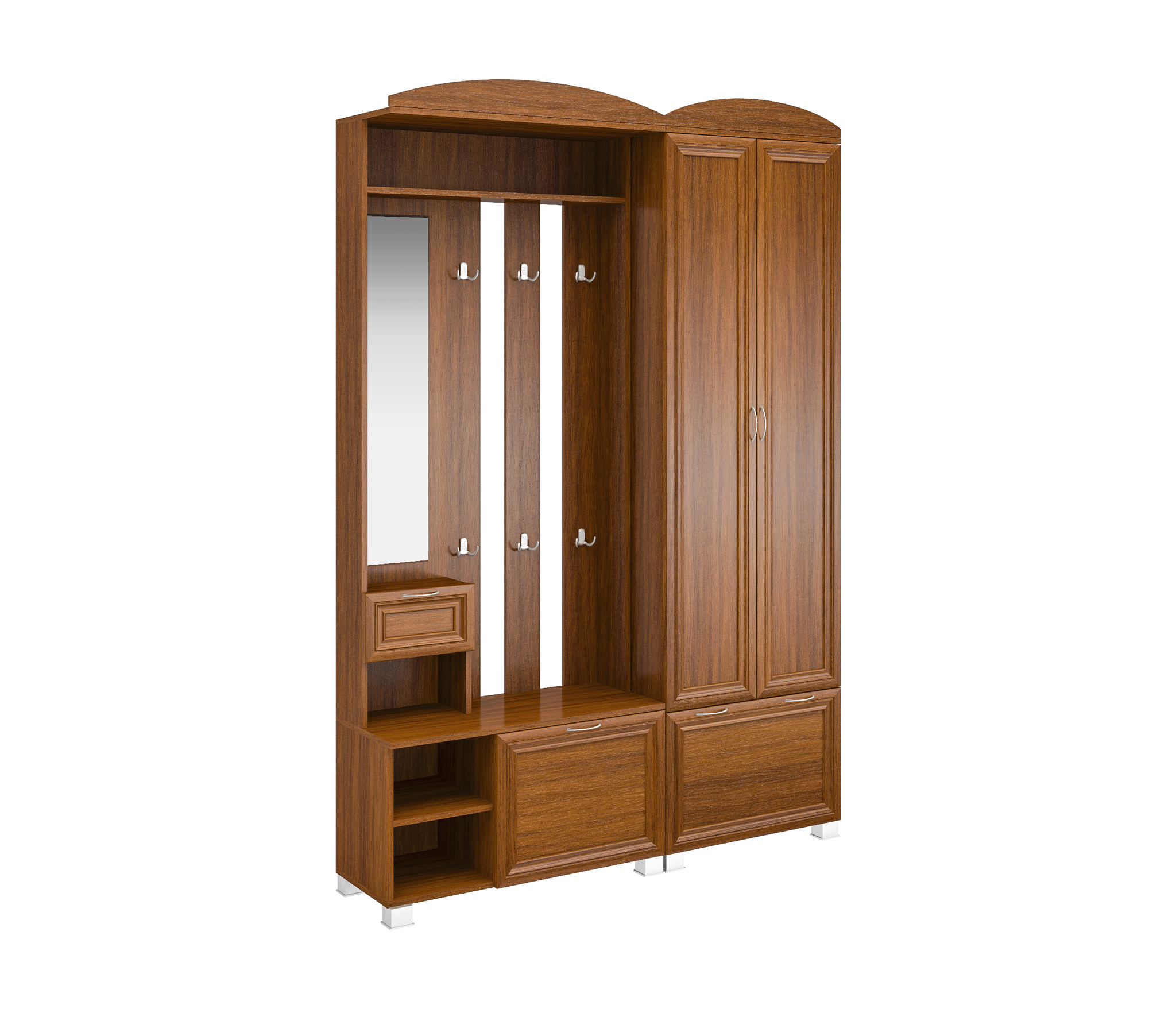 Корпус прихожей выполнен из Ламинированной ДСП высшего качества с насыщенным цветом. Фасады выполнены из материала МДФ и дополнительно укреплены металлическими скобами и силиконом изнутри.Шириною 140 см., это небольшой комплект из двух модулей, тумбы-вешалки и шкафа. В шкафу две распашные двери и одна откидная. Во втором модуле небольшое, но высокое зеркальце над маленьким ящиком. Имеются три ниши рядом с откидной дверью. На вешалке пять двойных крючков. Прихожая Шк-7 самое лучшее решение и идеально подходит как для не больших помещений, так и для средних.