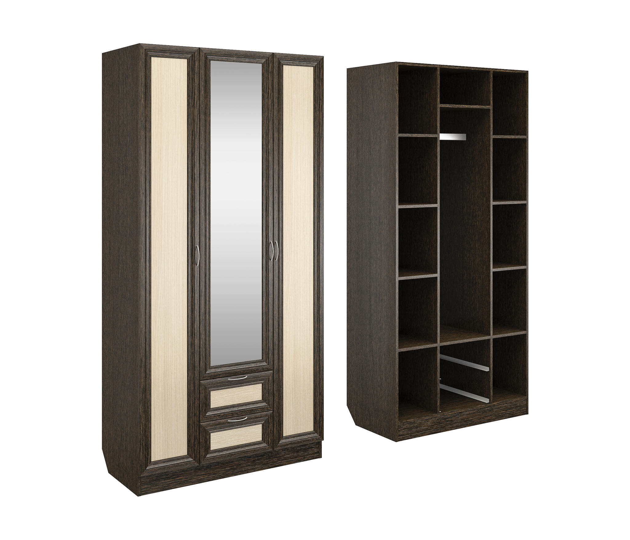 Корпус шкафа выполнен из Ламинированной ДСП высокого качества с насыщенным цветом. Фасады выполнены из материала МДФ.В данной моделе установлено зеркало, которое монтируется прямо в рамку фасада двери шкафа непосредственно на производстве.Шириною 100 см., большая и функциональная модель с отделениями закрытыми на три распашные двери. С права и слева симметрично друг другу, за дверками, располагаются отделения по пять полок в каждом. В центре за дверкой вверху небольшое отделение, сразу под ним отделение со штангой, внизу располагаются два выдвижных ящика. В данной моделе встроено одно зеркало в дверку и оно уже включено в стоимость шкафа.