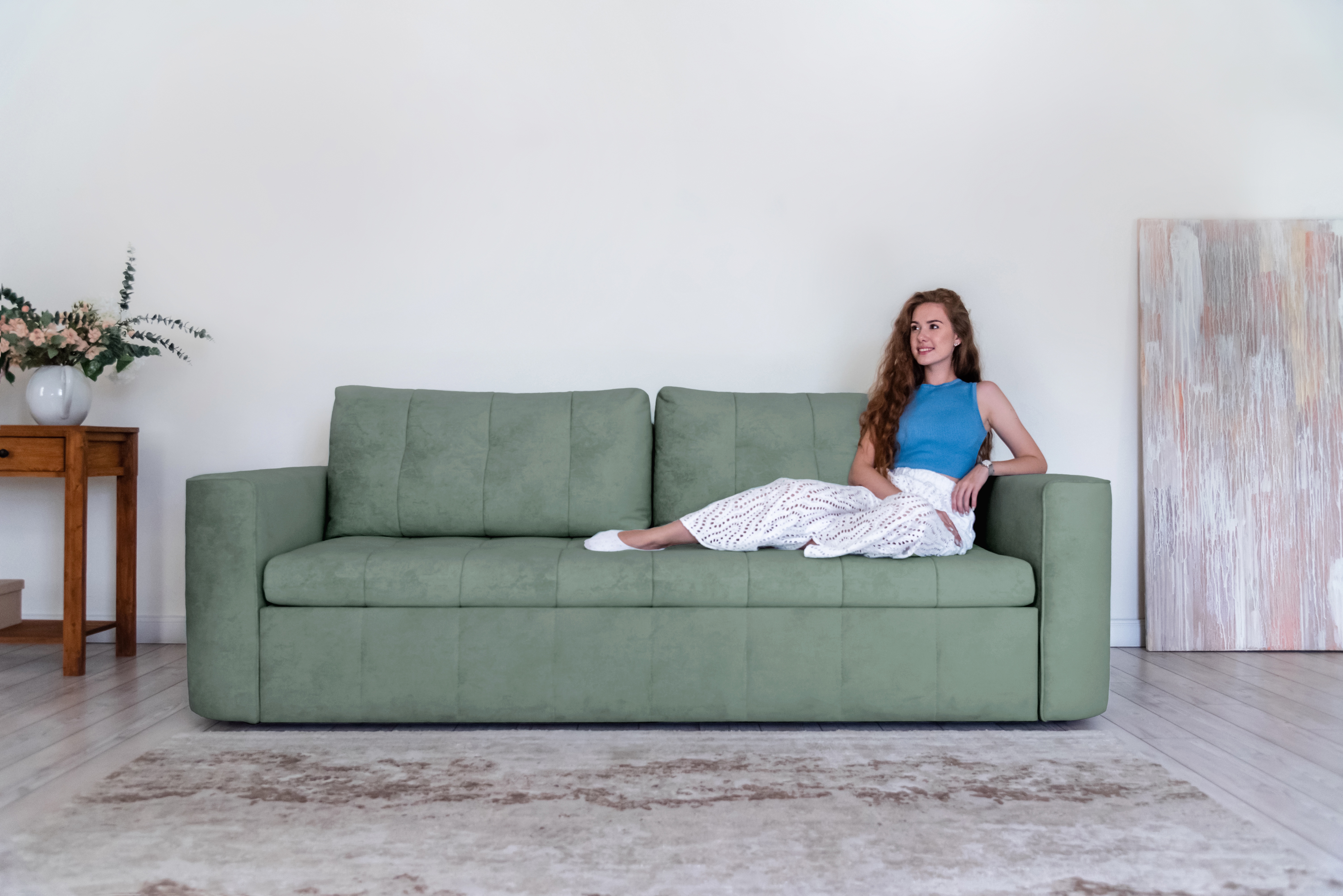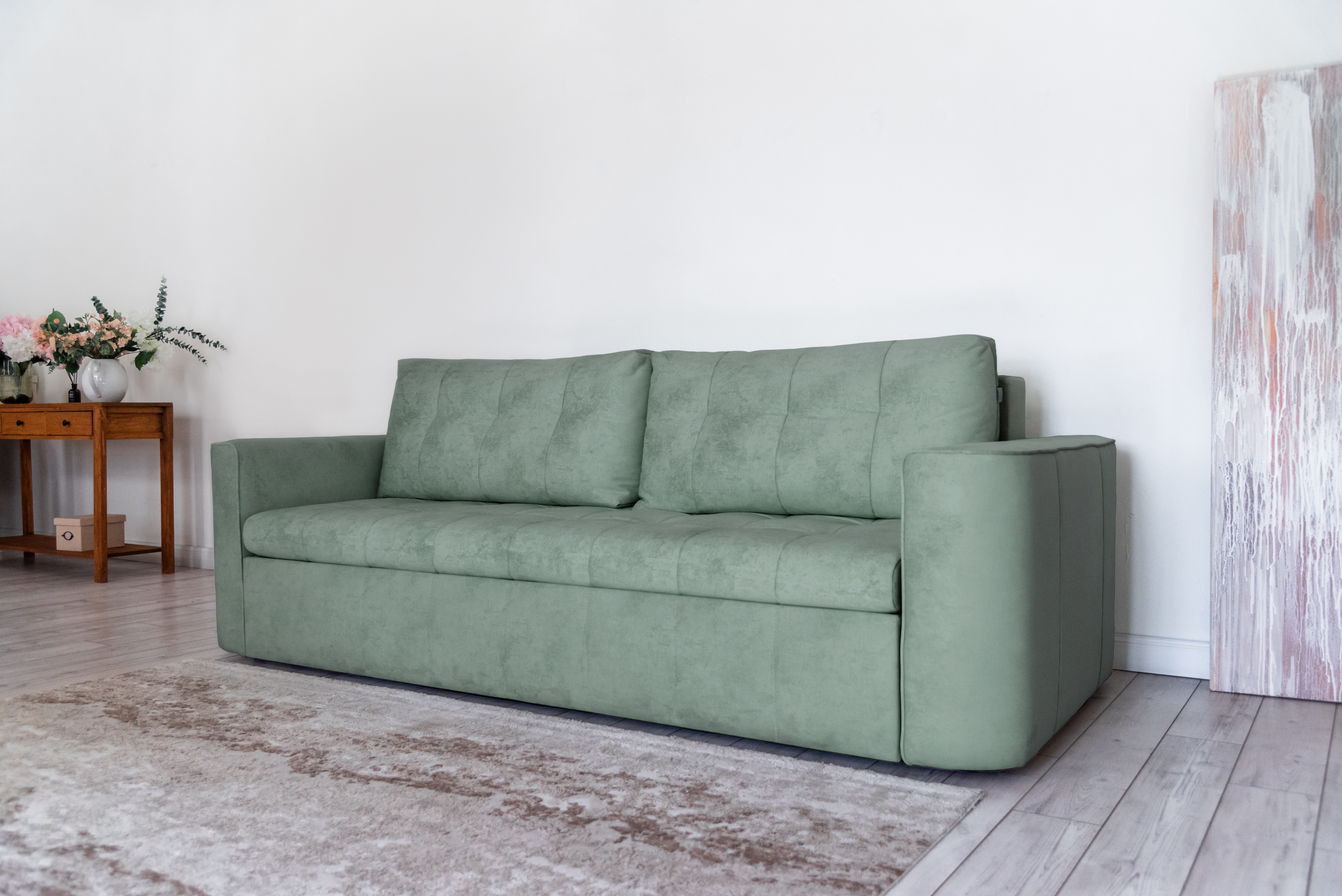 Стильный прямой диван BOSTON создан для тех, кому важна практичность и комфорт: надежный металлокаркас, мягкие ткани и быстрая трансформация в спальное место! Спинка защищает от соприкосновения со стеной во время сна.