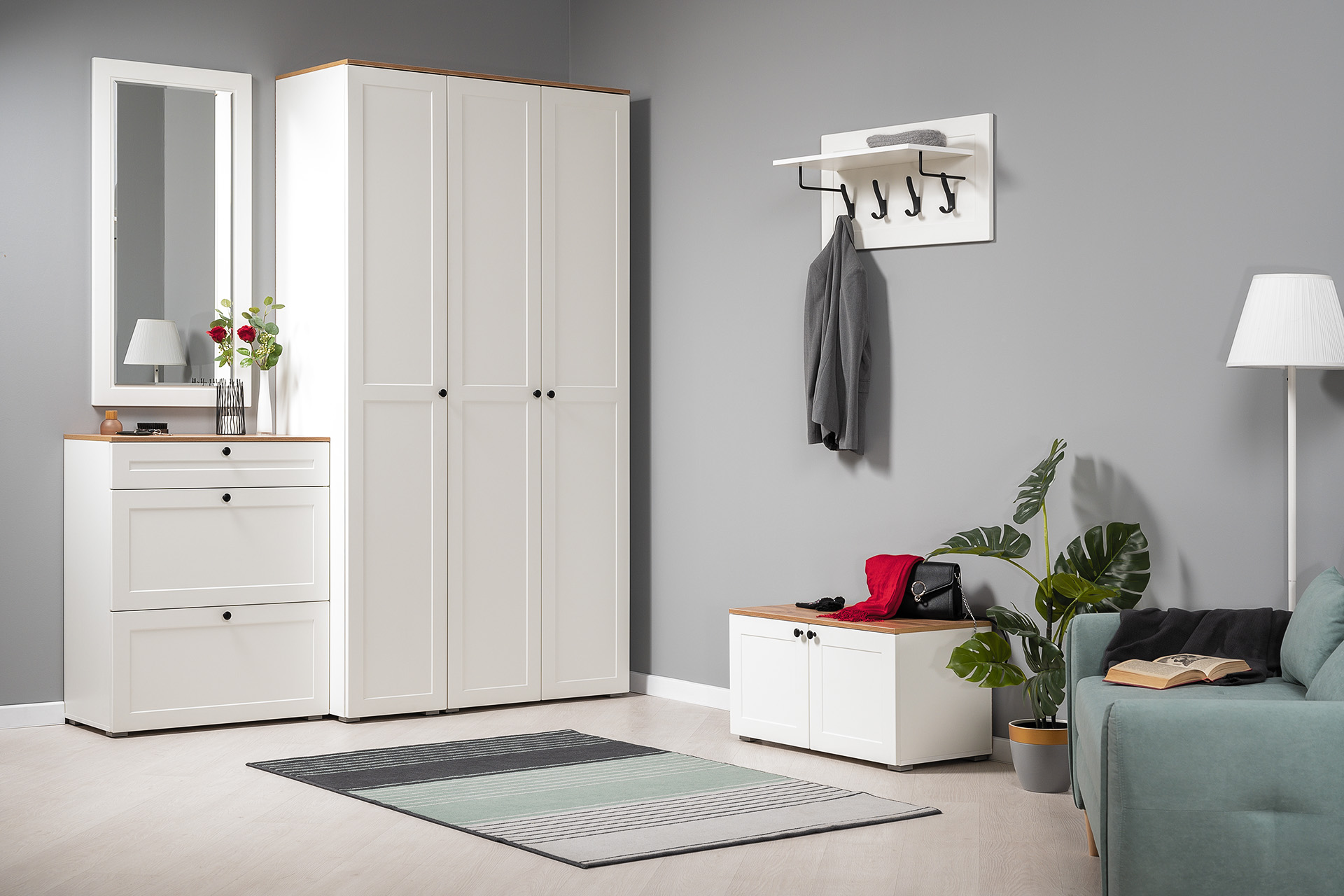 Вместительная шкафная группа позволит оптимально организовать хранение, а продуманные габариты тумбы, комода и зеркала дают возможность собрать различные компоновки.