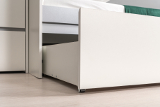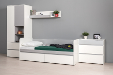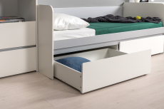 В основании кровати оборудованы два выдвижных ящика для постельных принадлежностей и личных вещей ребёнка. Ящики достаточно вместительные и установлены на колесные опоры, что обеспечивает им легкое выдвижение. Отсутствие лицевой фурнитуры и открывание фасадов за край - не только стилевое, но функциональное решение. Так мебель занимает меньше места и дает возможность проходить вплотную с фасадом без риска зацепиться за ручку или травмироваться. Базовый белый цвет, сочетаясь с акцентным серым, создаёт нейтральную основу интерьера, чтобы подчеркнуть личные вещи и аксессуары. Корпуса и фасады мебели изготовлены из экологически чистой ламинированной ДСП 16 мм, торцы окромлены ПХВ плёнкой 0,4 мм. В производстве молодёжной Торонто использованы качественные материалы и фурнитура - можно разрабатывать проект на весь период обучения. Поставляется кровать с ящиками Торонто 11.39 в разобранном виде, надёжно упакованной в гофрокартон, с приложенной подробной инструкцией по сборке. Выполнена в цвете: белая шагрень/стальной серый. Материалы изготовления: ламинированная ДСП 16 мм, кромка ПВХ.