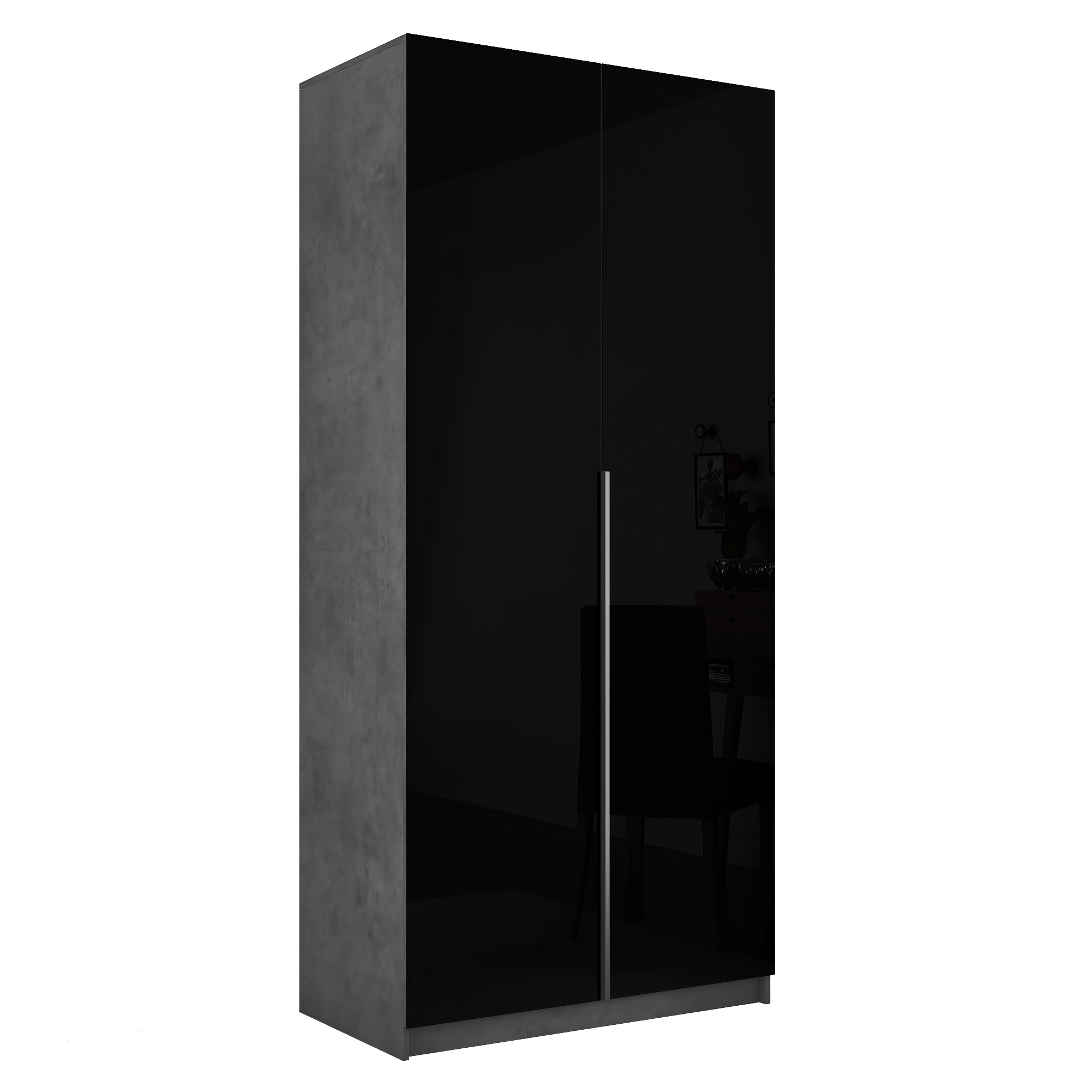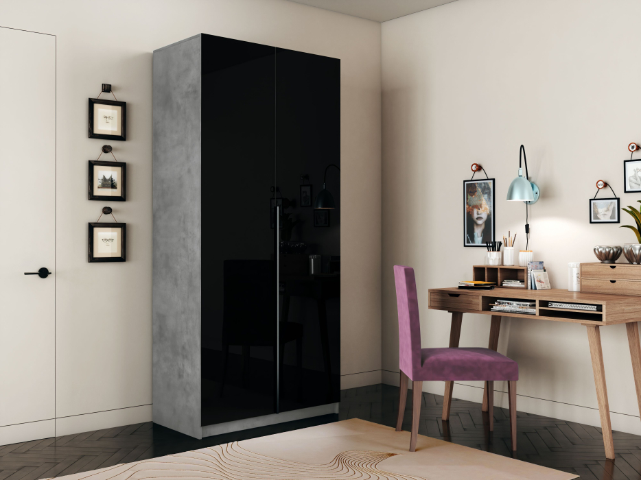 Фасады шкафа изготовлены из стекла черного цвета, оклеенного противоосколочной пленкой с внутренней рамкой из ЛДСП Бетон.
