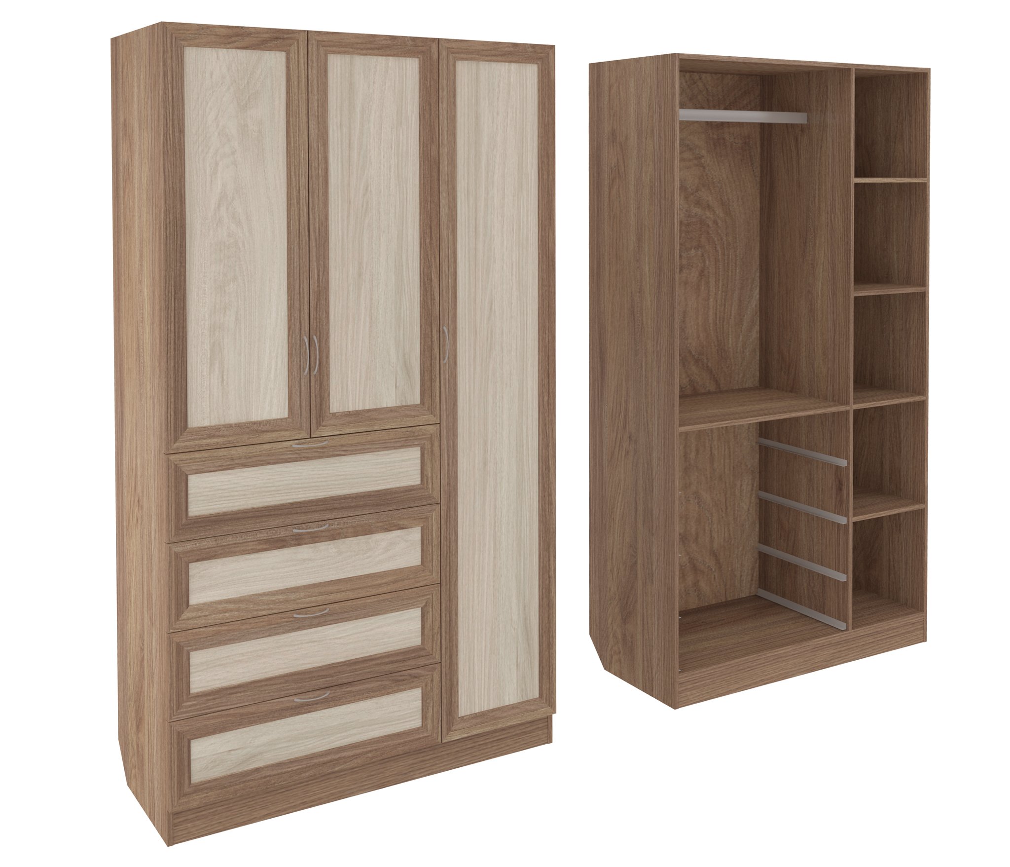 Корпус шкафа выполнен из Ламинированной ДСП высокого качества с насыщенным цветом. Фасады выполнены из материала МДФ.Ширина шкафа 120 см., большая и функциональная модель. Справа за длинной дверцей пять кубических ниш. Слева сверху вниз, узкая ниша, секция со штангой для одежды и четыре достаточно вместительных выдвижных ящика.