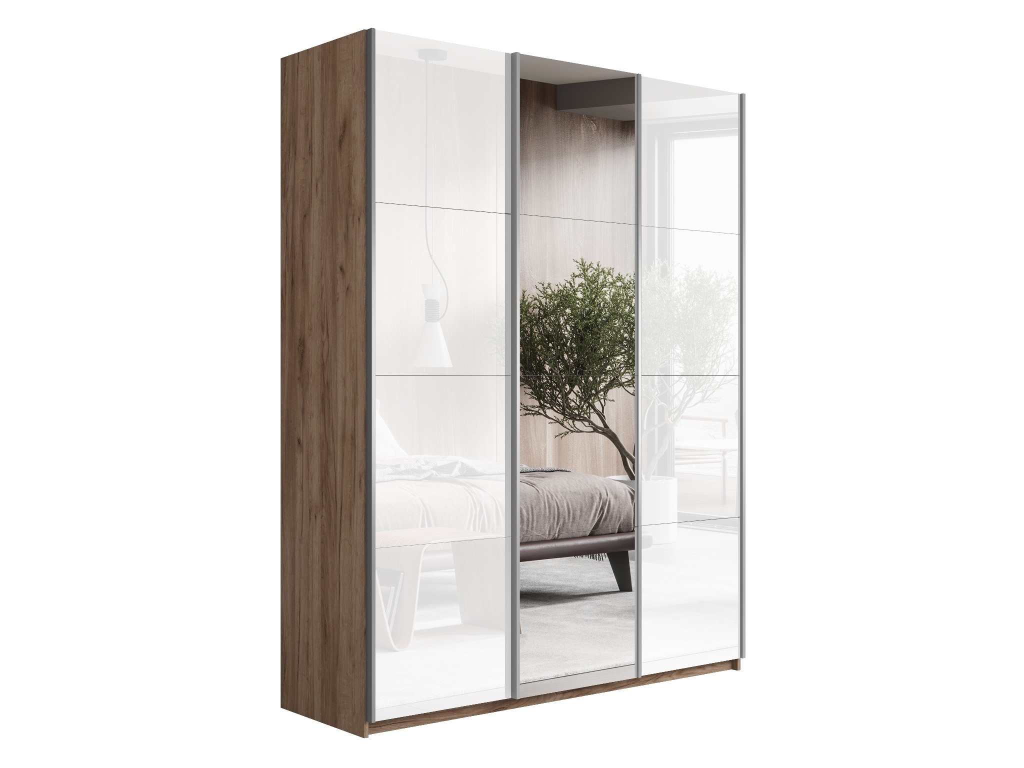 Шкаф Прайм трио 2-ва Стекла белого+ Зеркало 2300 х 1800 х 570 (Дуб/крафт/табак)