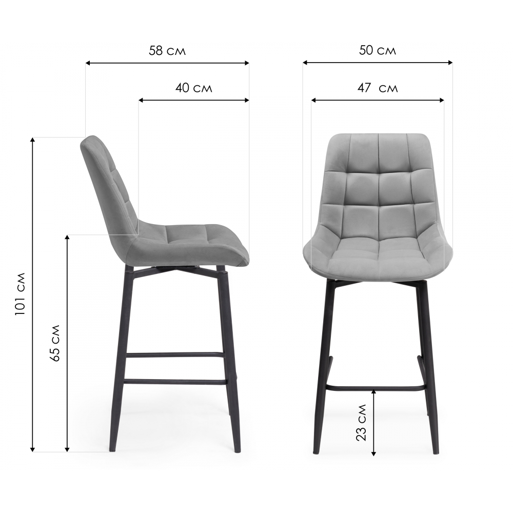 Высота подножки: 22 см. Материал каркаса - Металл; Материал сиденья - Велюр; Материал ножек - Металл; Материал обивки - Велюр; Цвет каркаса - Черный; Цвет ножек - Черный; Ширина - 50; Глубина - 58; Высота - 101; Ширина сиденья - 47; Глубина сиденья - 40; Высота сиденья - 65.