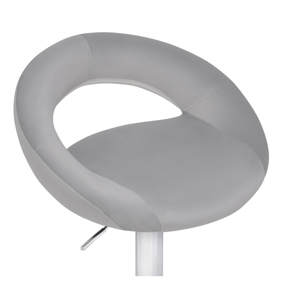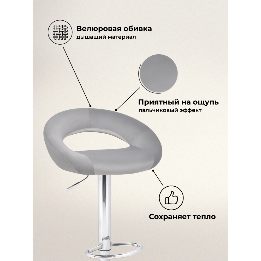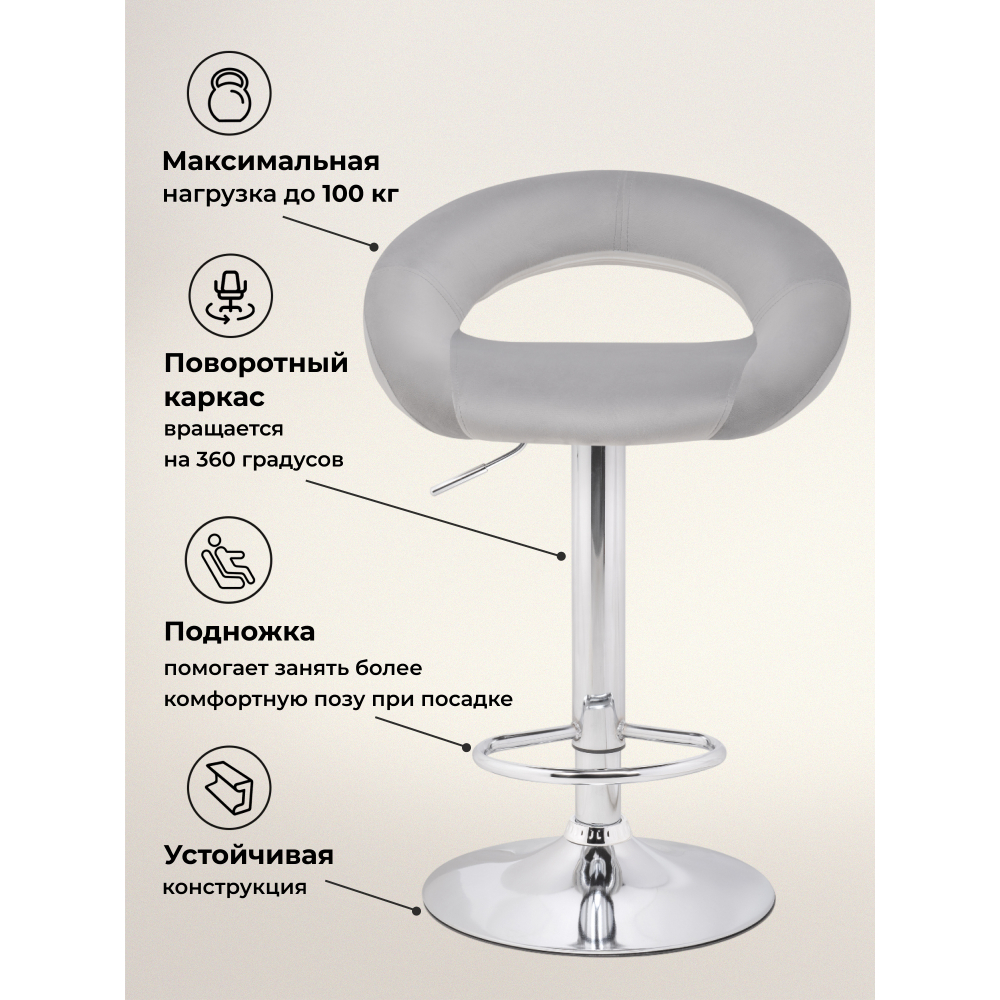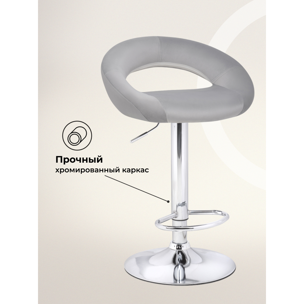 Внимание! Барный стул поставляется без декоративного кольца у основания. Материал каркаса - Хромированный металл; Материал обивки - Кожзаменитель или велюр; Цвет ножек - Хромированный металл каркас; Ширина - 51; Глубина - 46; Высота - 80; Глубина сиденья - 36; Высота сиденья - 59; Высота сиденья максимальная - 80,5; Высота максимальная - 101,5.