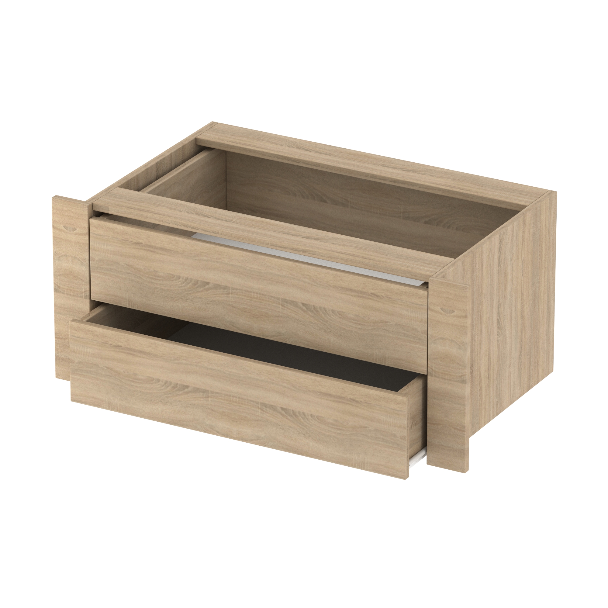 Ширина по фасаду 600 мм Модуль изготовлен из ламинированного ДСП. Он идет в виде куба, внутри которого два выдвижных ящика. Модуль ставится на любую полку и прикрепляется к ней. Ящики двигаются по металлическим направляющим. Направляющие работают бесшумно и плавно, надежны и долговечны.