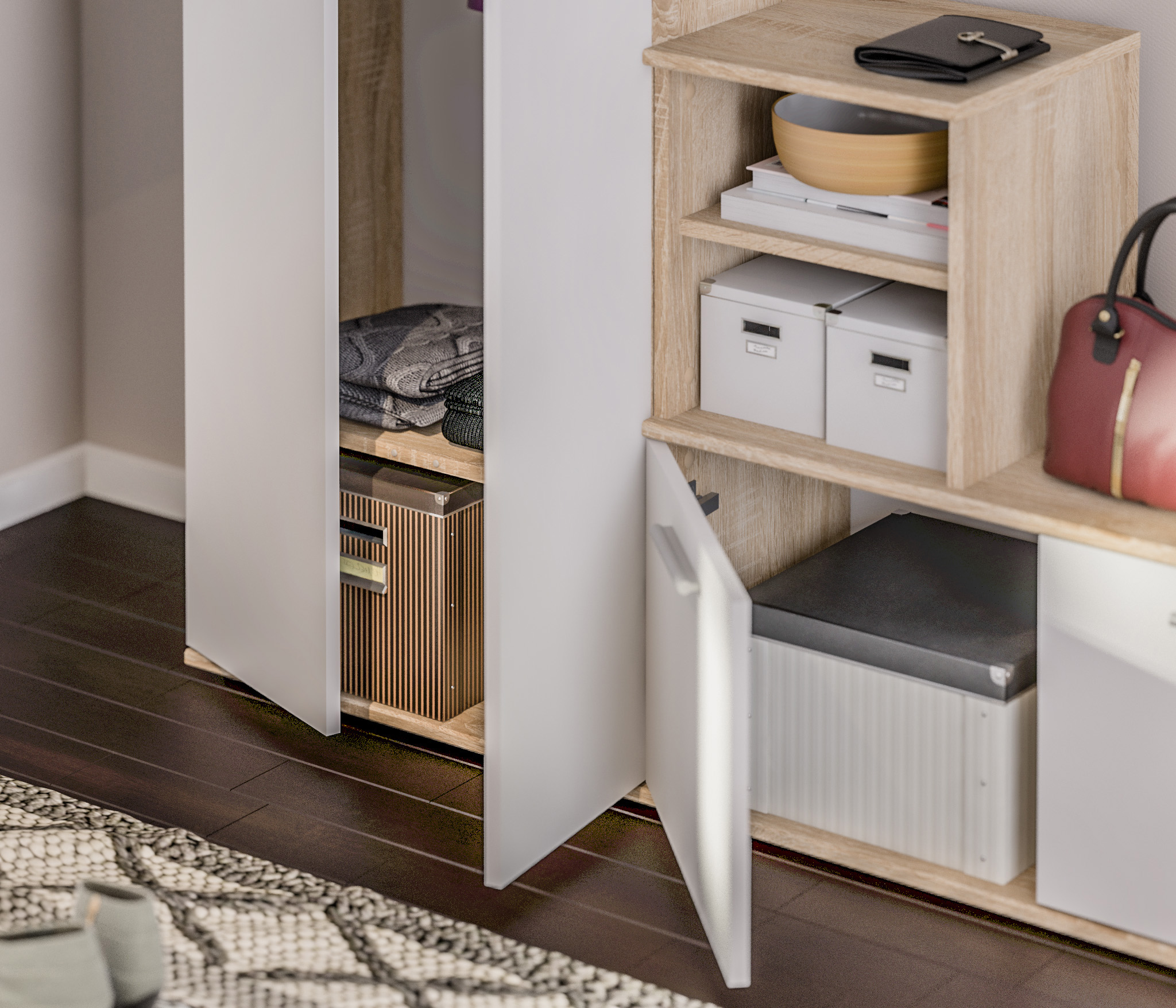 Габаритные размеры – ширина 87 см, высота 76 см и глубина 35 см. В двух вместительных отделениях тумбы помещается до восьми пар обуви. Каждое отделение имеет отдельную дверцу. На двух открытых полках можно хранить различные мелочи. Тумба произведена из экологичного прочного КДСП, устойчивого к мелким механическим повреждениям. Отделка комбинированная – корпус в цвете «Дуб Сонома», фасадные поверхности чисто белые. Тумба снабжена протекторами, которые сберегут пол от царапин.
