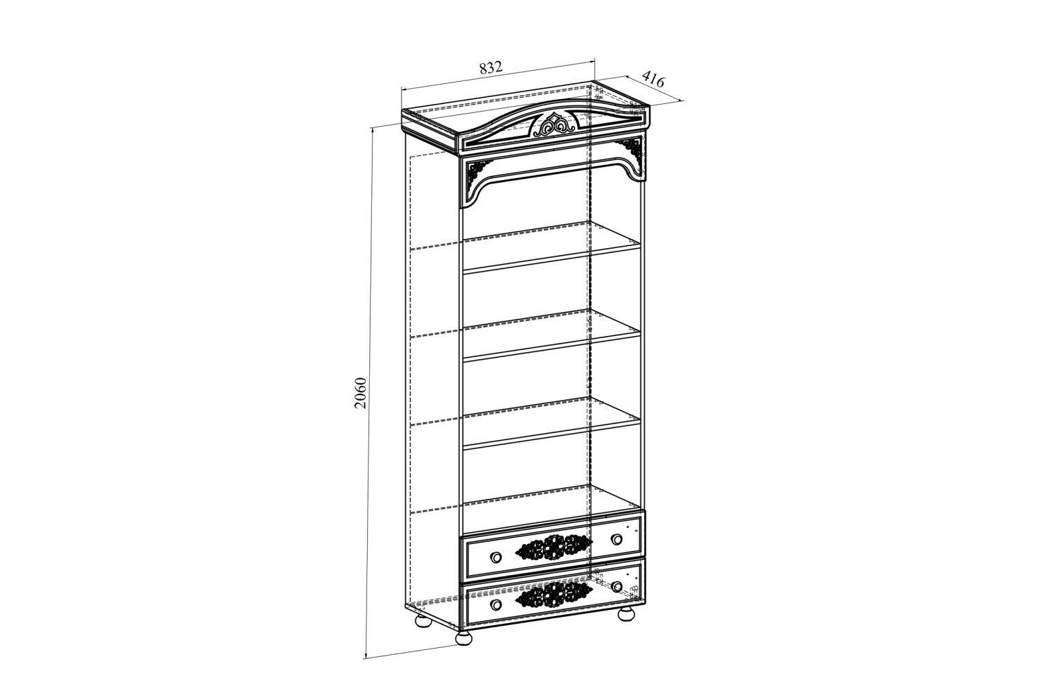 Стеллаж с открытыми полками и двумя выдвижными ящиками. Высота полок 323 мм. Высота верхней полки — 516 мм. Высота боковых стенок каждого ящика 130 мм, ширина ящика 708 мм, глубина 350 мм. Ящики установлены на телескопических направляющих полного выдвижения.