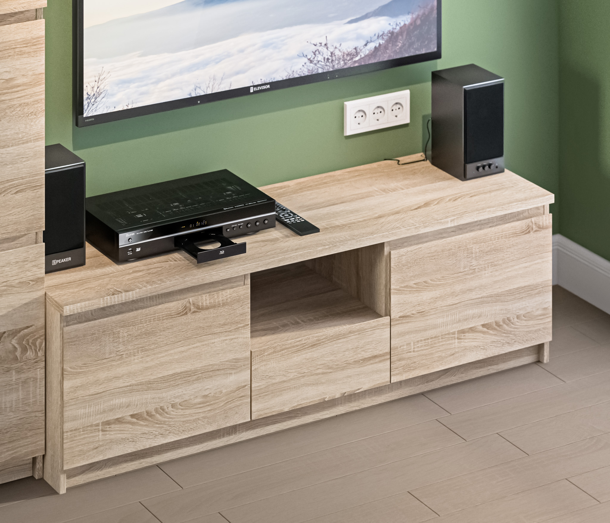 Габаритные размеры – ширина 140 см, высота 44 см и глубина 44 см. Вес тумбы 33,92 кг, что даёт возможность передвигать её по усмотрению. Визуально тумбу можно разделить на три отделения. В центре над выдвижным ящиком расположена открытая полка. По бокам два вместительных отделения за отдельными дверцами. Отличительной особенностью тумбы является отсутствие ручек, которые интегрированы в фасады. ¶Тумба выполнена в лаконичном дизайне из экологичного современного ЛДСП. Материал отделки устойчив к влаге и воздействию бытовых чистящих средств, что актуально для светлых поверхностей.