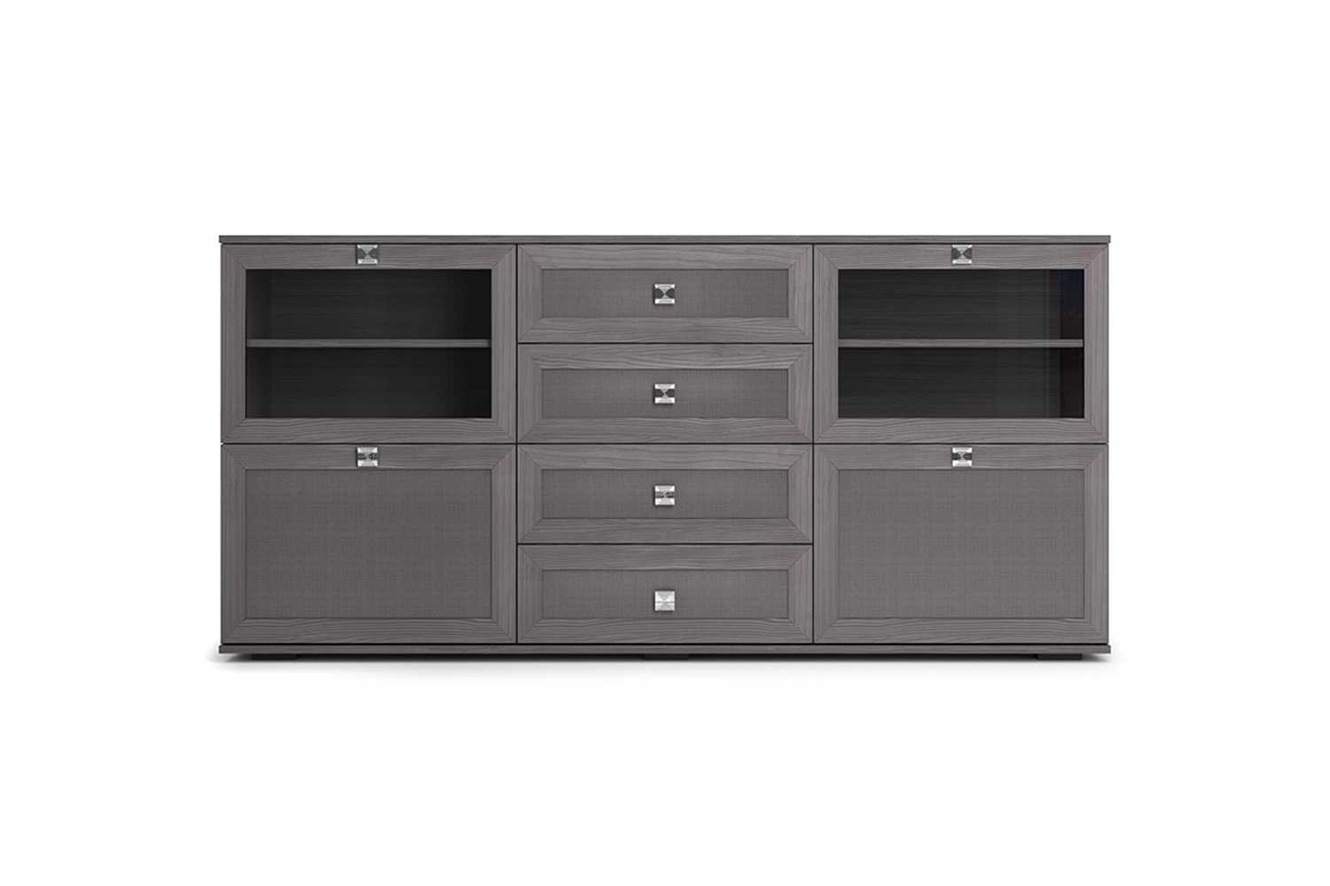 При меблировке спальни в современном стиле обратите внимание на большой функциональный комод в коллекции Парма Нео. Этот модуль наделен отличной системой хранения, в нем присутствуют выдвижные ящики, отделения с дверками. Благодаря наличию стеклодверей изделие смотрится более легким и имеется возможность красиво расставить фужеры или другую красивую посуду на стеклополках. Четыре выдвижных ящика помогут аккуратно хранить белье, аксессуары и другие предметы обихода.
