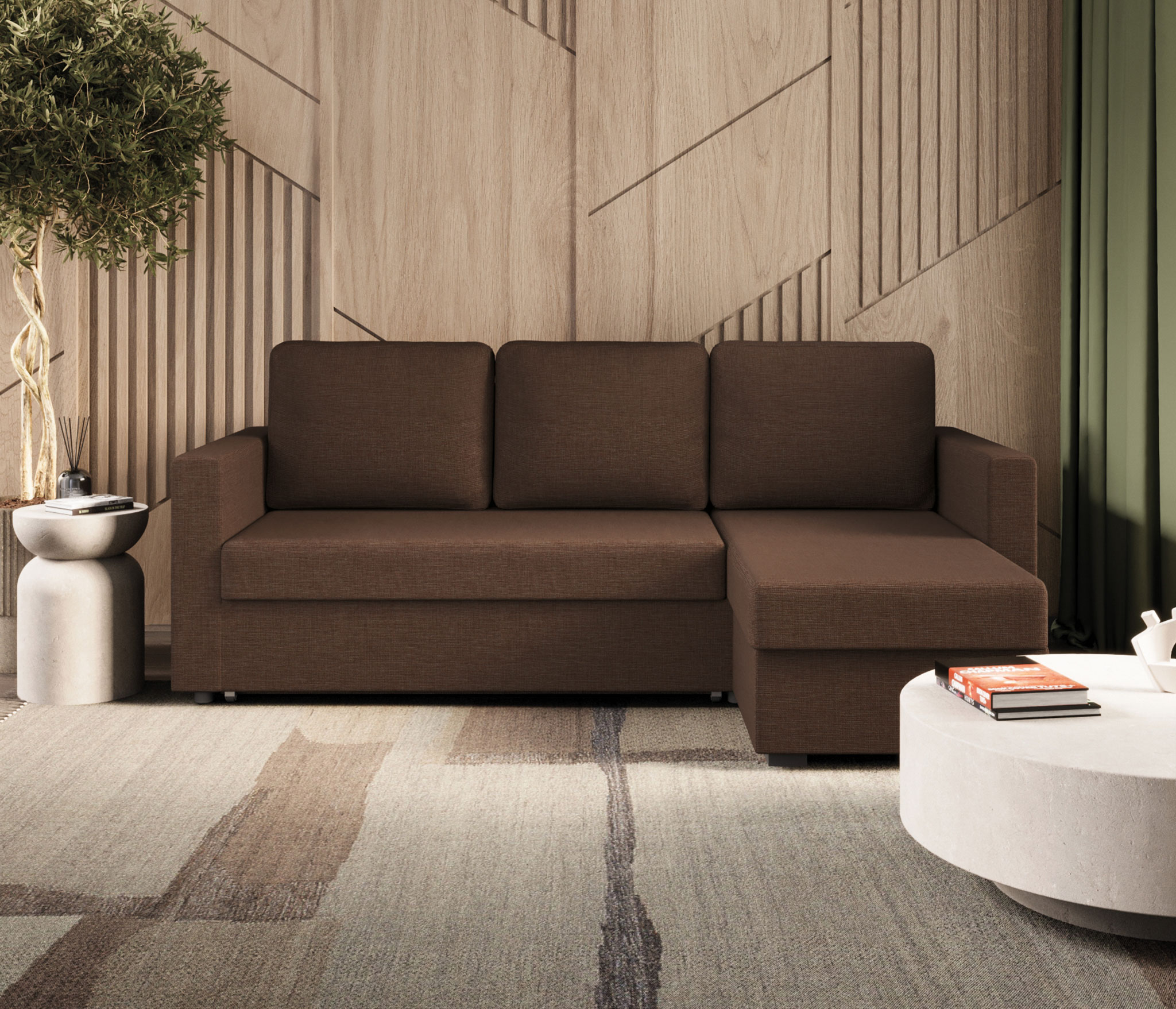 Стильный и практичный угловой диван «Джессика» с выкатным механизмом трансформации «Дельфин» и вместительным бельевым ящиком станет центральным элементом зоны отдыха в интерьере, созданном популярном стиле «скандинавский минимализм», который основан на гармоничном сочетании простоты, практичности, обилия света, комфорта и функциональности. Поэтому здесь нет вычурного декора, а только прямые линии, мягкая, сдержанная цветовая гамма, обивка под «мешковину» и угловая геометрия, позволяющая рационально использовать пространство и исключающая необходимость приобретать дополнительные места для сиденья.