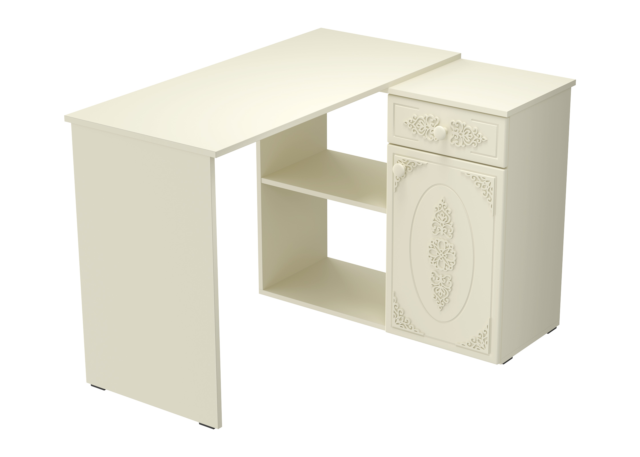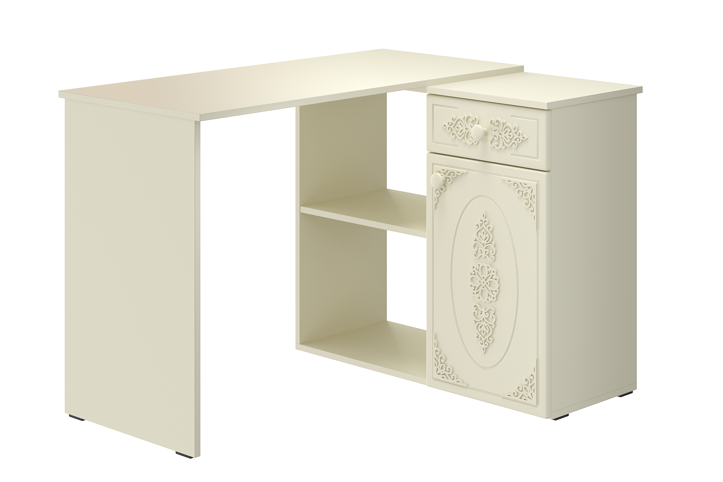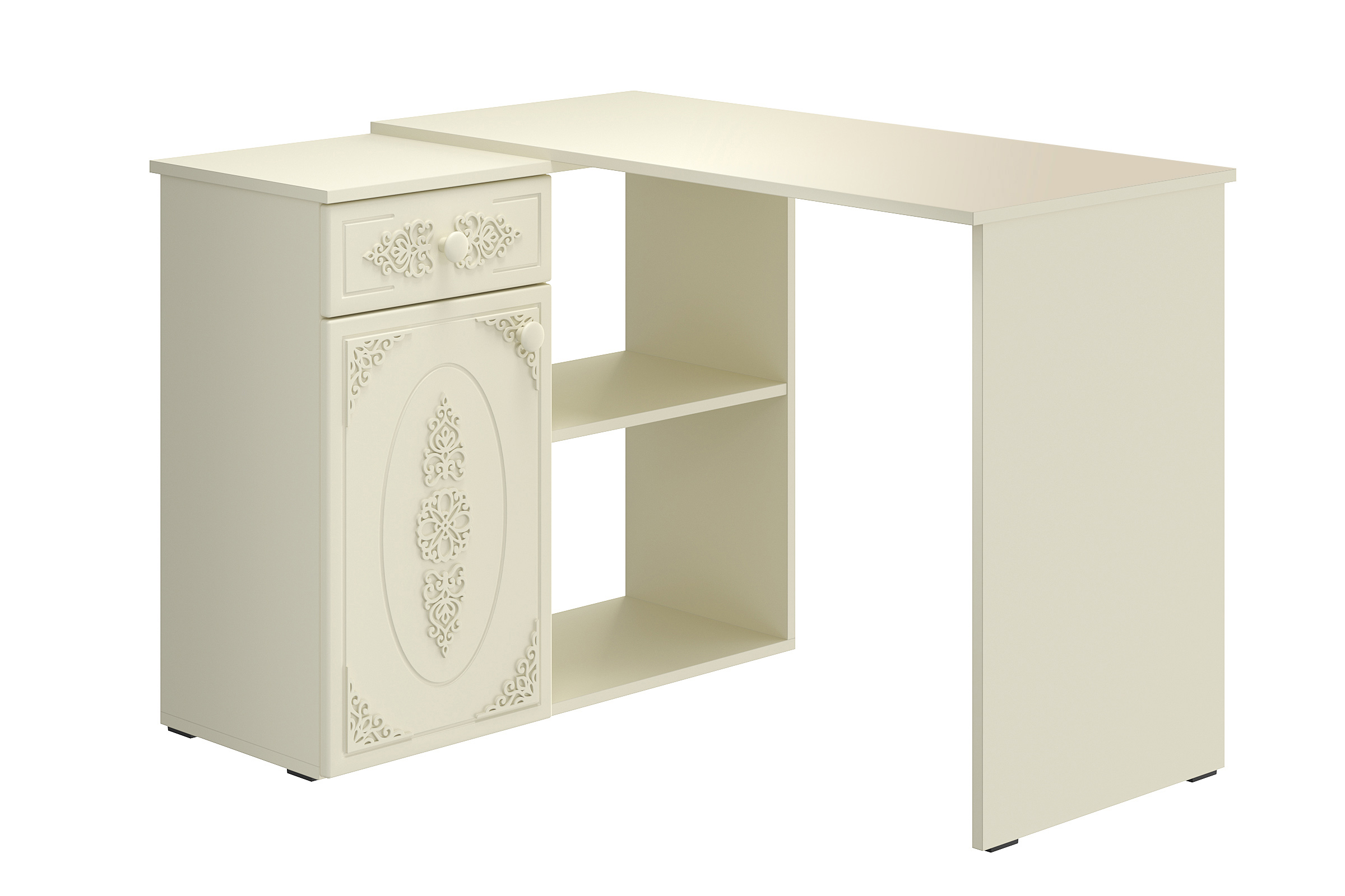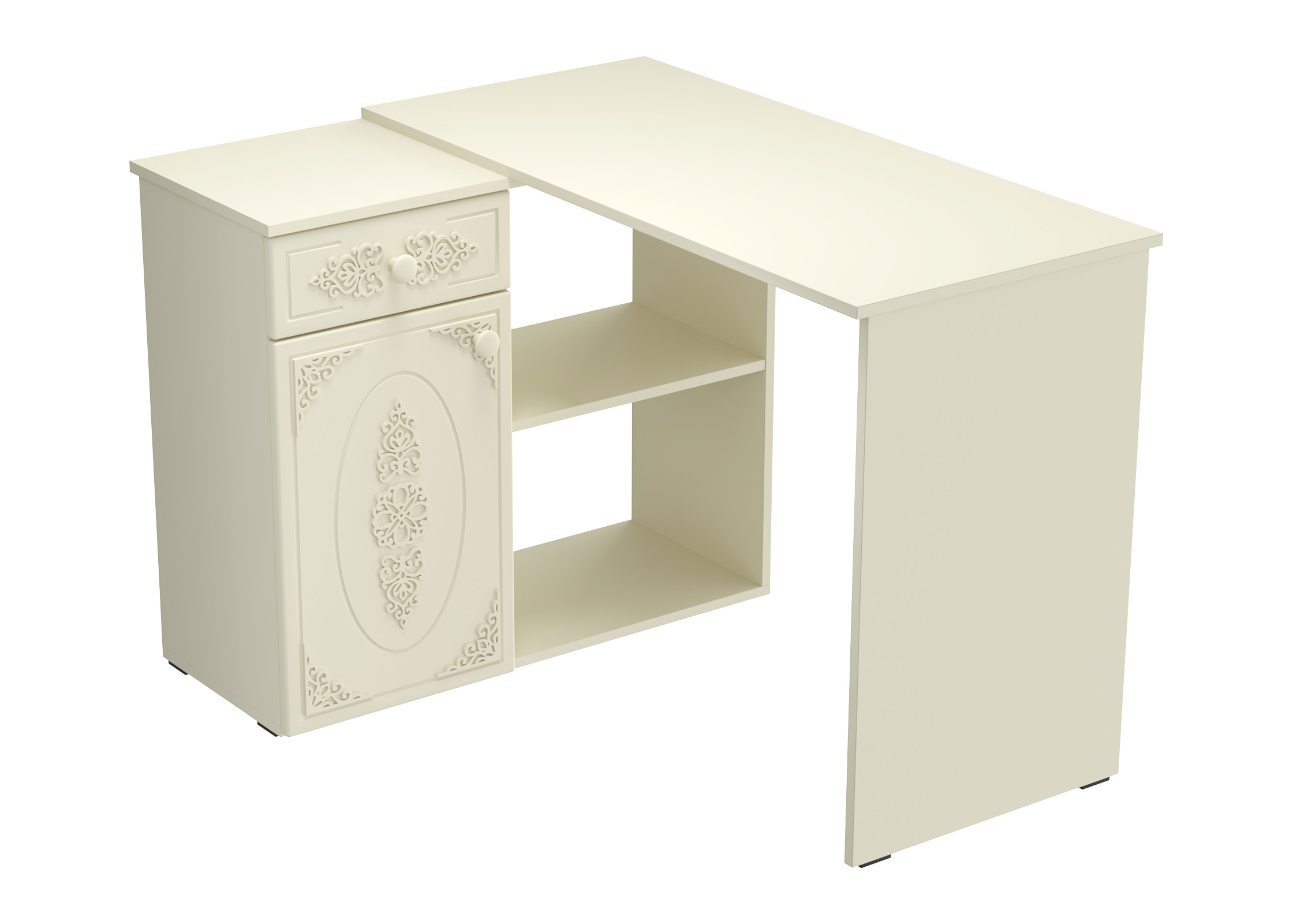Угловой стол Ассоль АС-67 станет отличным местом для работы. В выдвижном ящике можно хранить блокнот, канцелярские принадлежности. Стильный дизайн позволит разместить в любом современной интерьере. Модуль может быть собран в зеркальном варианте "правым" или "левым". Фурнитура: телескопические направляющие полного выдвижения, петли с доводчиками.