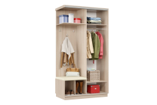 Дверь делит шкаф на 2 равные части: отделение для верхней одежды и отделение с полками и крючками.