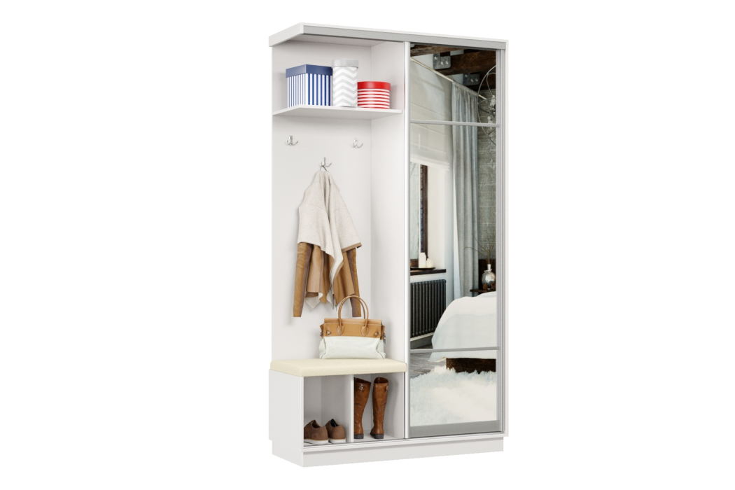В прихожей используется одна дверь, которая перемещается по однополосному треку вправо или влево, закрывая или открывая каждую из двух частей шкафа.