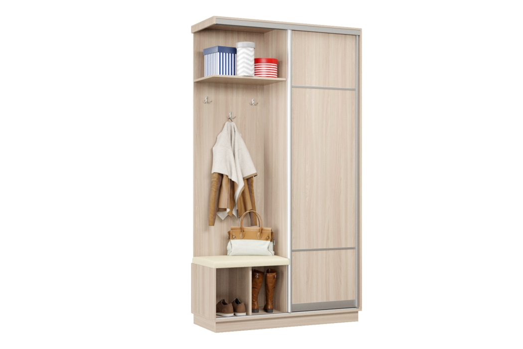 За счет применения системы купе прихожая отлично зарекомендовала себя в узких коридорах, где распашная дверь ограничивает пространство. Несмотря на небольшие габариты, прихожая-купе получилась функциональной и практичной.