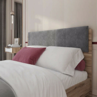 • Мягкая панель в изголовьи кровати выполнена из: ЛДСП 10 мм + ППУ 20 мм + ткань с эффектом замши серого цвета. Эффект замши кроется в пряже. Две и более нитей с различной круткой образуют на поверхности ткани "мраморность", эффект муаровых переливов, который на расстоянии придает сходство с замшей