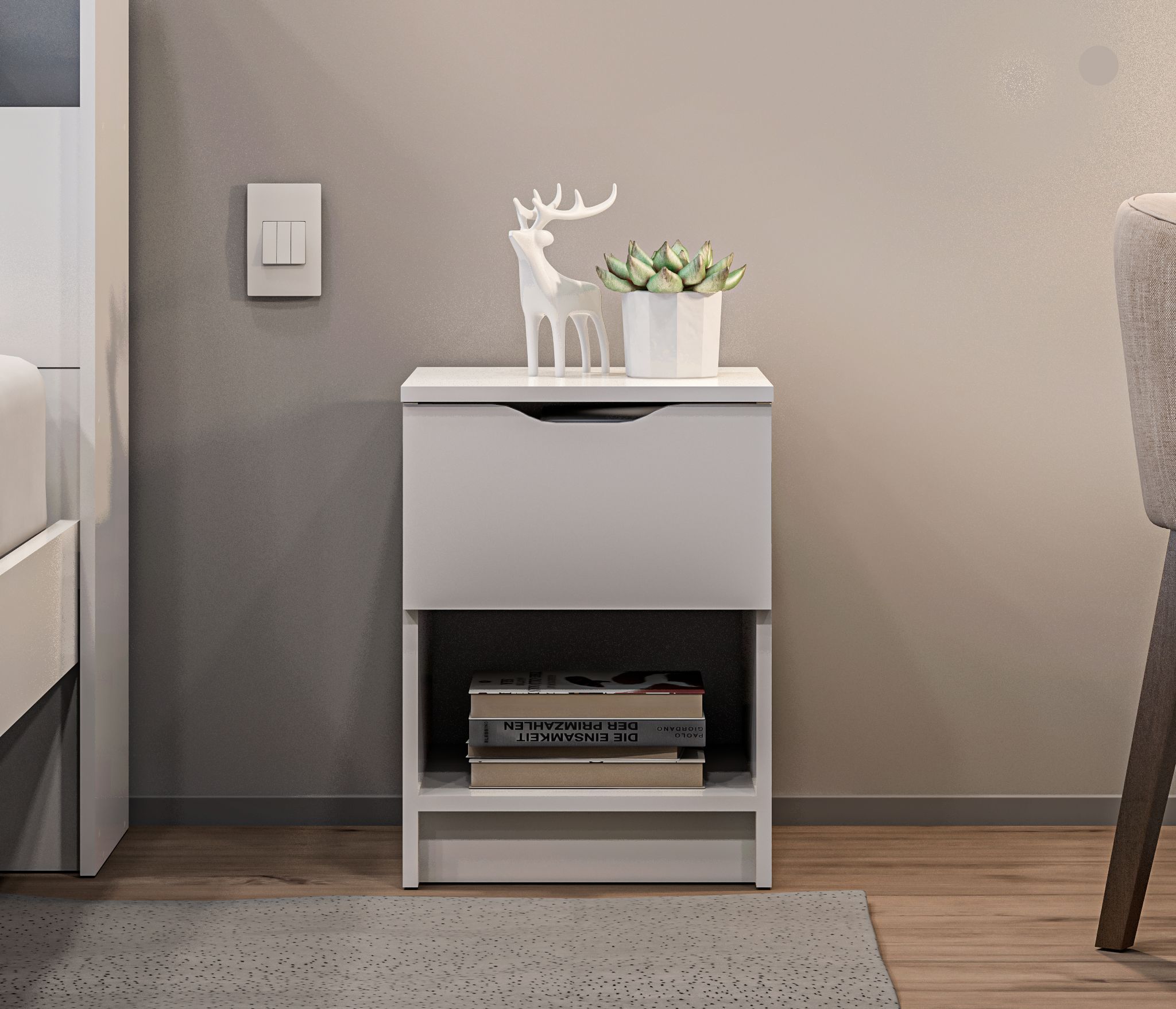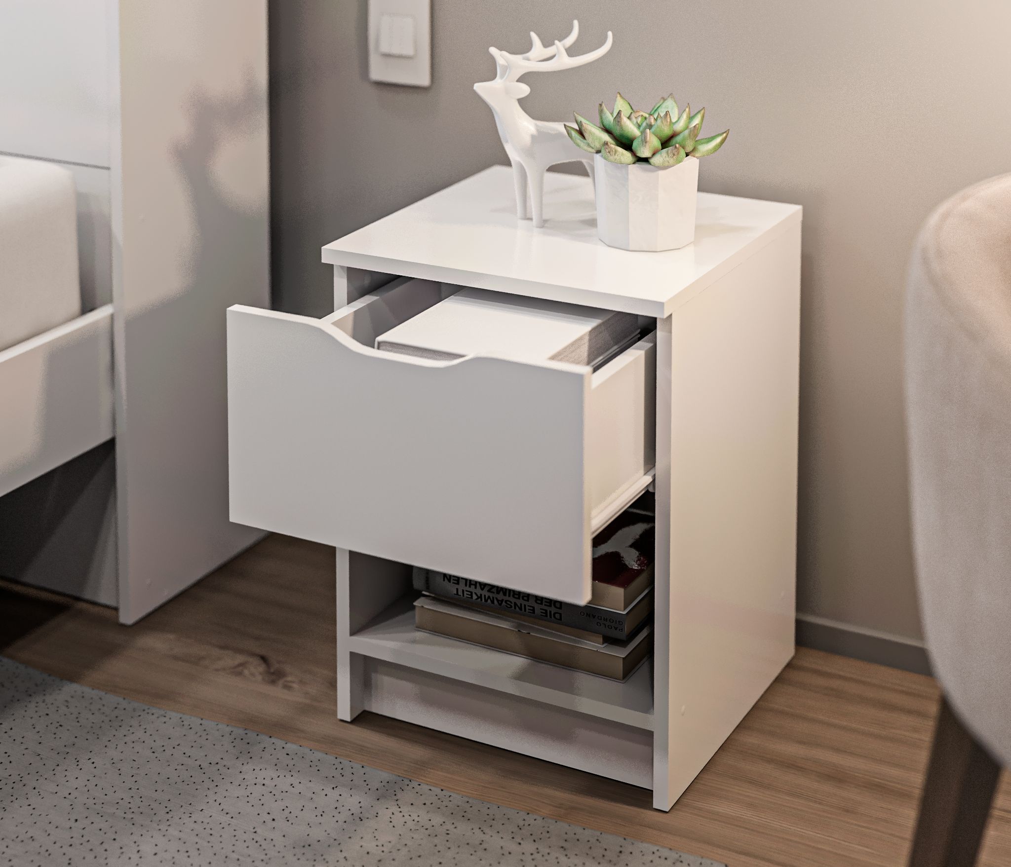 У тумбы есть один выдвижной ящик, который позволяет хранить различные предметы. Также имеется открытая полка, которая идеально подходит для размещения книг, журналов или других предметов, которые хотите иметь под рукой перед сном или по утрам.