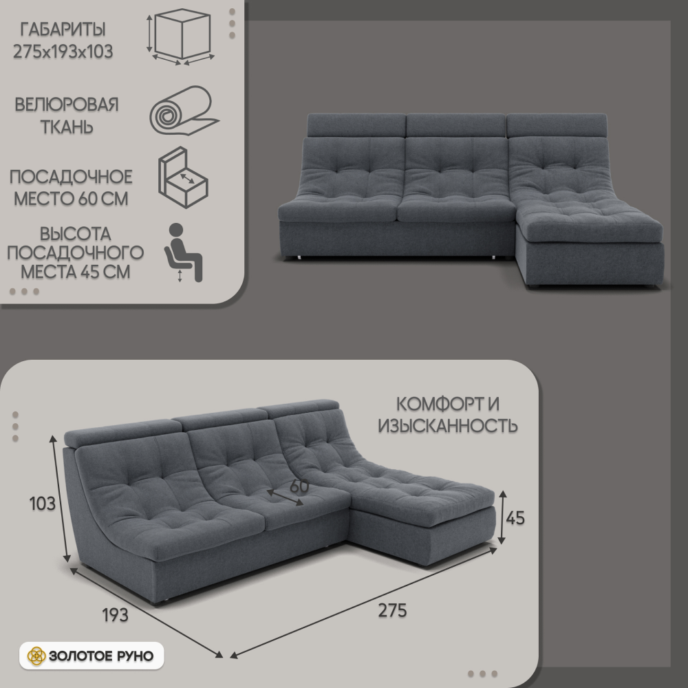 Отзывы о Столплит Угловой диван Монако-2 ППУ, велюр Серо-голубой