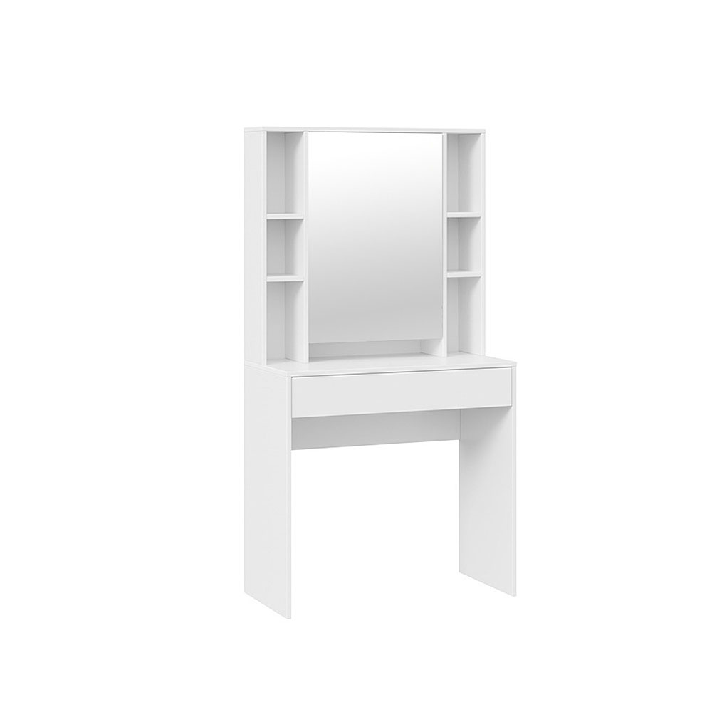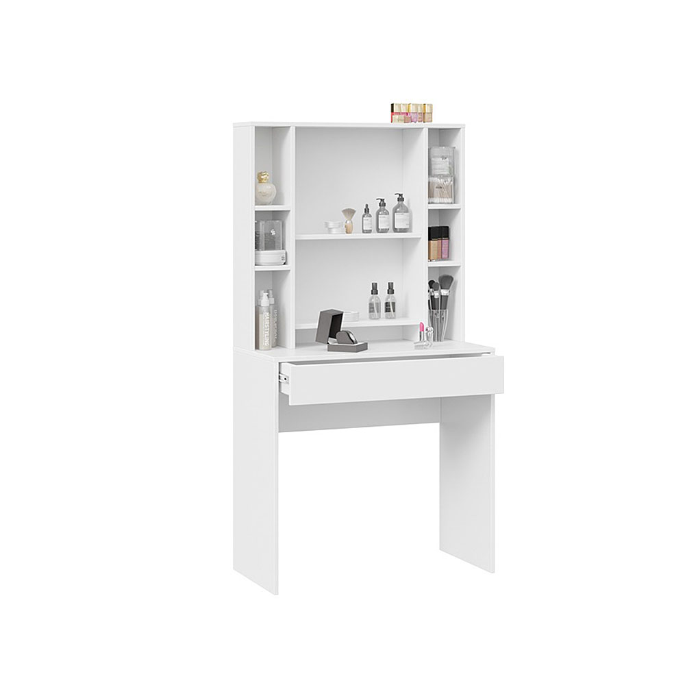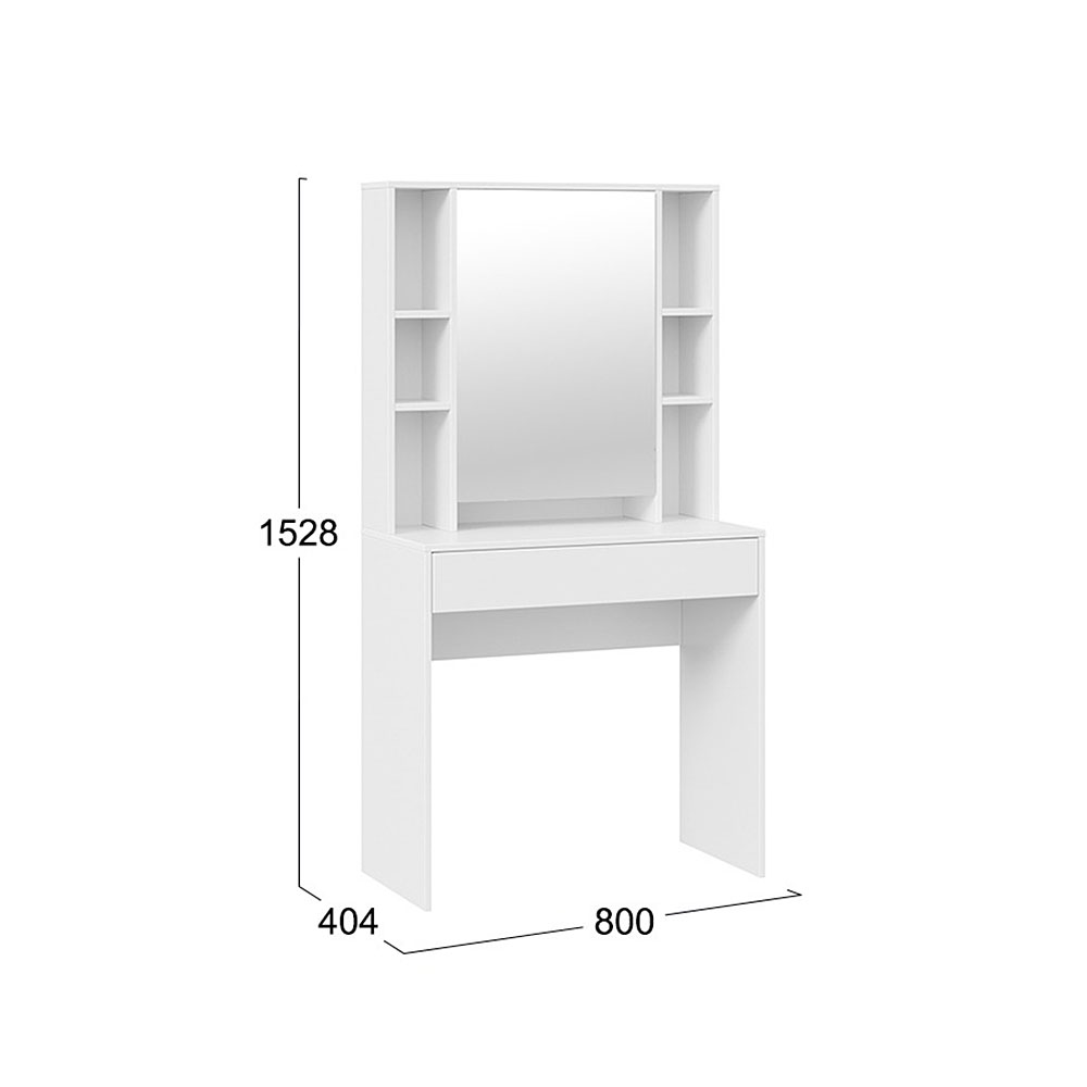 Помимо внешней привлекательности стол имеет большое зеркало, за которым размещены скрытые полки для хранения всех необходимых аксессуаров и косметики. Наличие открытых полок позволит установить предметы декора, а практичный выдвижной ящик добавит места для необходимых мелочей. В этом туалетном столике нет ничего лишнего, только самое необходимое для уголка женской красоты.