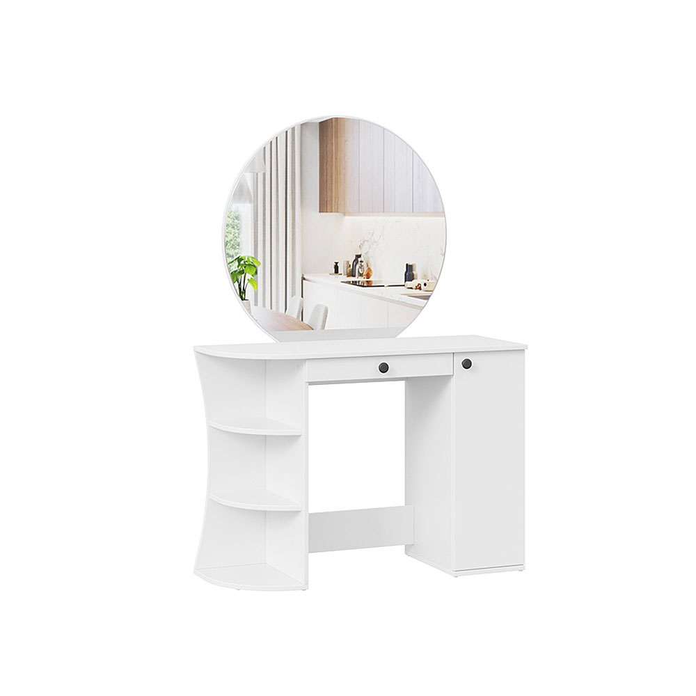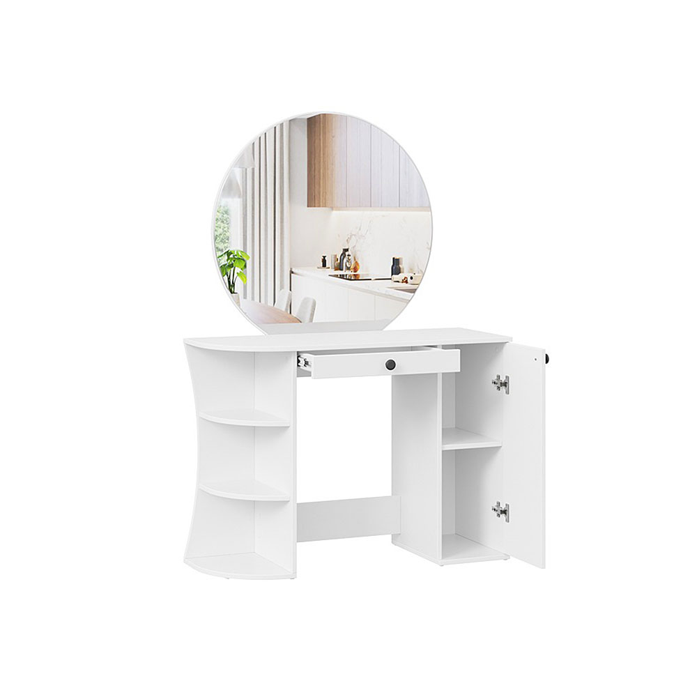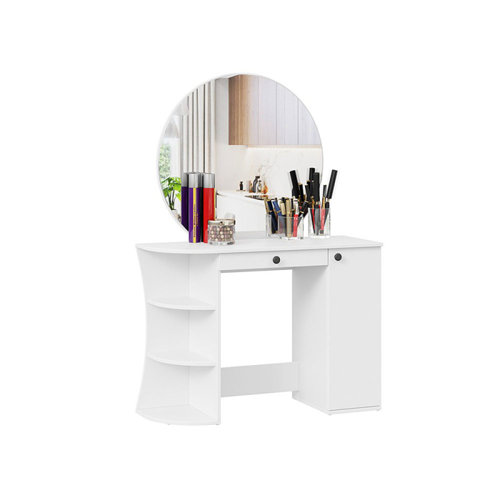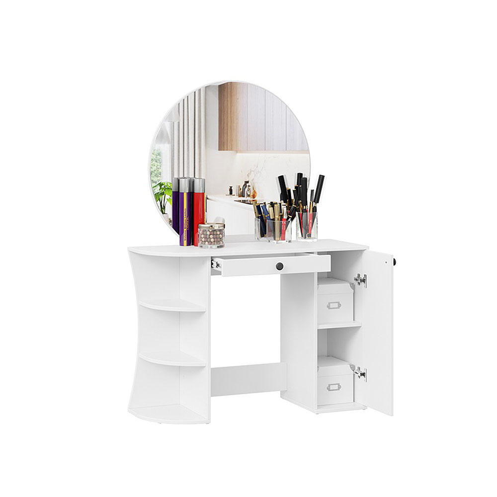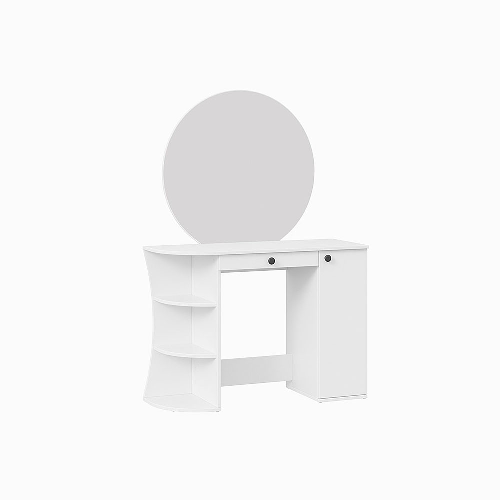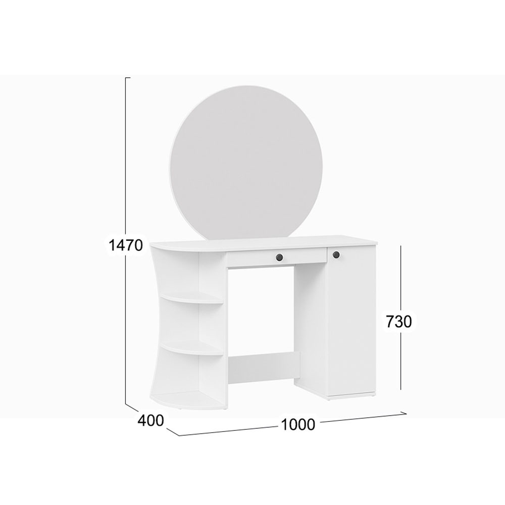 Помимо внешней привлекательности стол имеет большое круглое зеркало, вместительную столешницу под которой располагается как открытая ниша для хранения, так и с дверцей, где можно разместить все необходимые аксессуары и косметику. Такое количество мест для хранения позволит Вам сократить время на создание своего неповторимого образа.