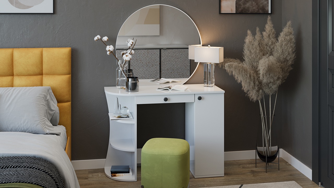 Стол туалетный с использованием белой гладкой текстуры, подойдет к интерьеру, выдержанному в современном стиле, и станет отличным решением для обустройства уголка красоты дома или квартиры.