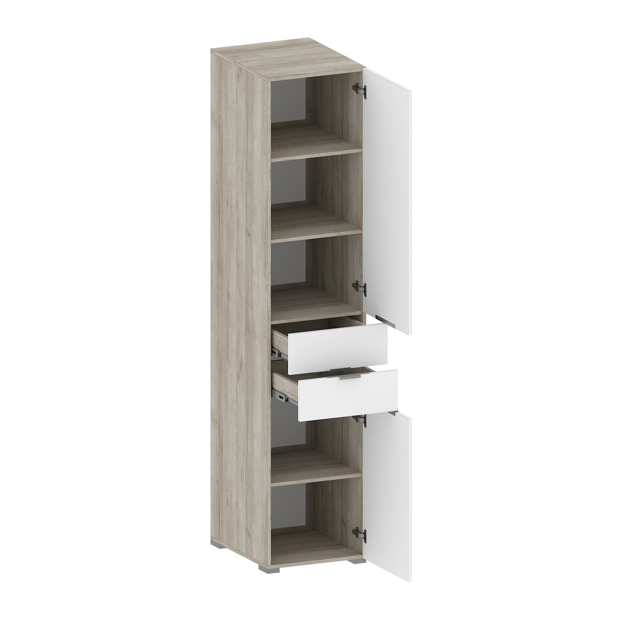 Прямой светлый распашной шкаф имеет две двери (две глухих) и два выдвижных ящика с использованием механизма полного выдвижения и плавного закрывания, дно ящика выполнено из ЛДВП в цвет корпуса.