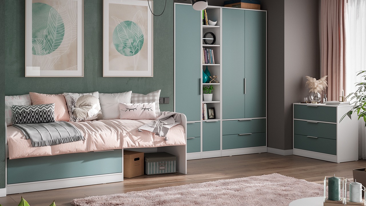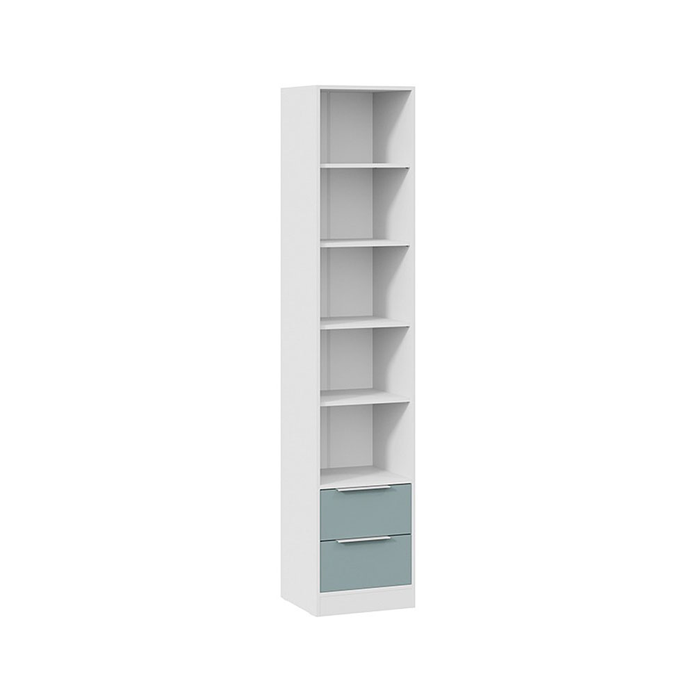 Серо-голубой цвет фасада в сочетании с белой текстурой каркаса добавляет коллекции свежести и вдохновения. Мятный оттенок органично вписывается в различные стилевые направления в дизайне, а белые торцевые ручки завершают единый образ коллекции.