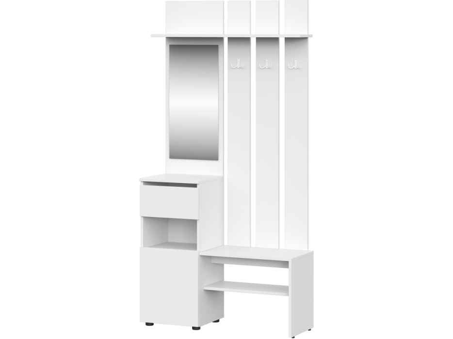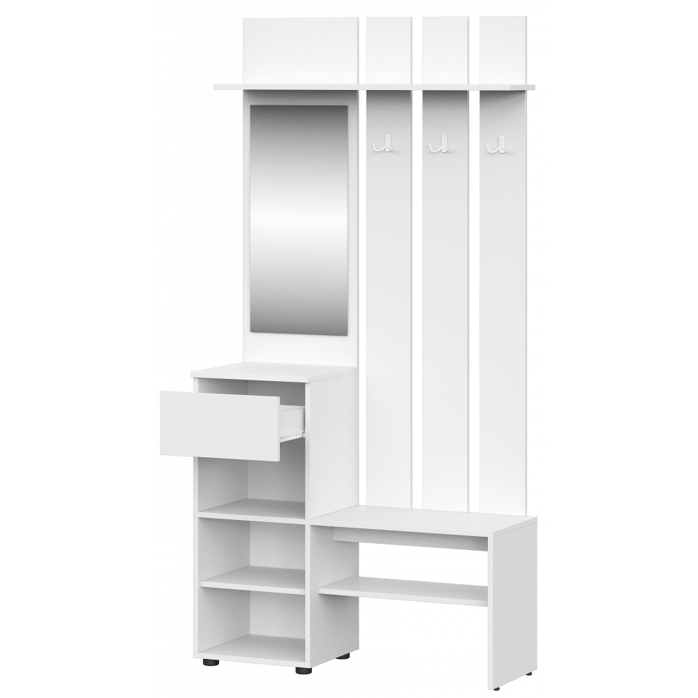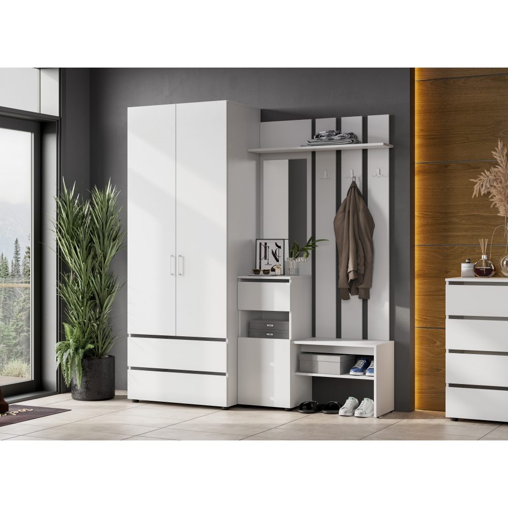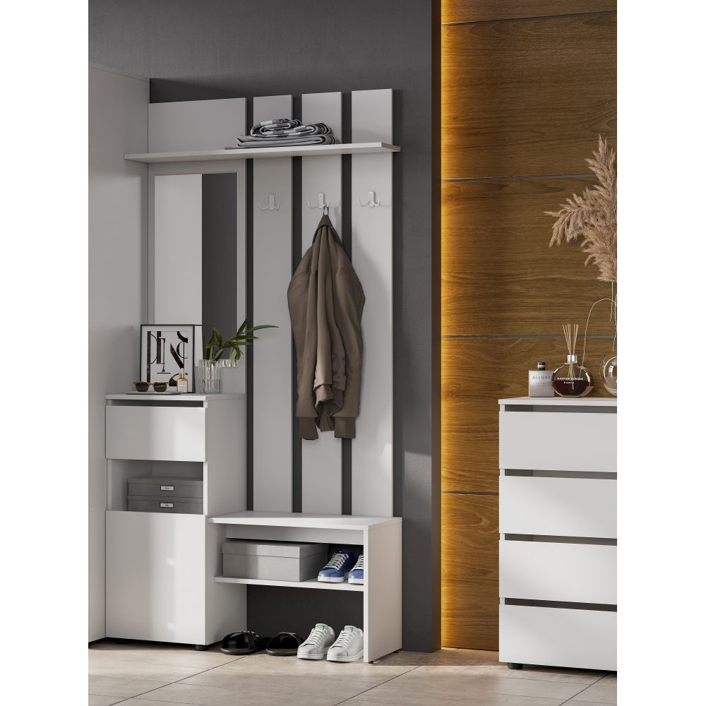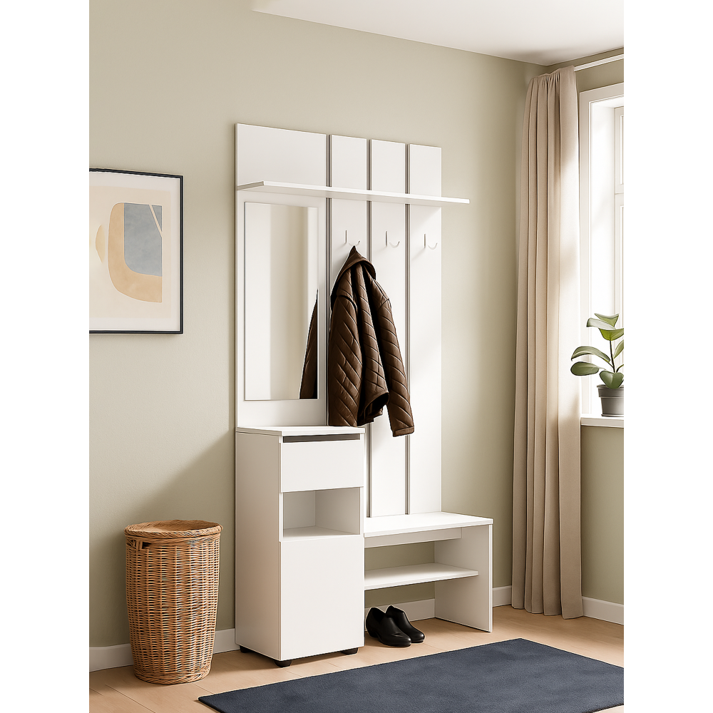 В прихожей также имеется небольшая скамья для обувания, под которой расположена полка для обуви и несколько крючков для верхней одежды. Это делает прихожую Валенсия удобной и практичной для хранения верхней одежды и обуви.