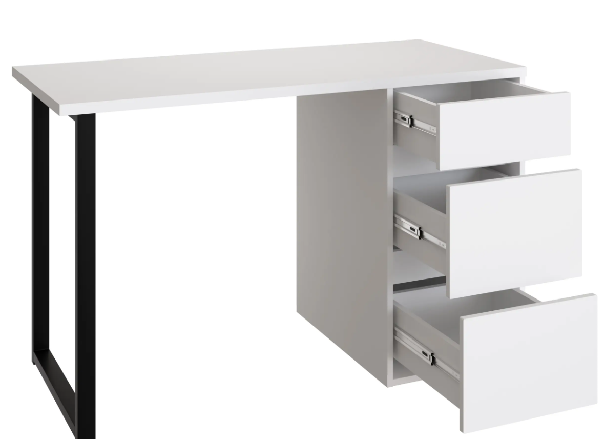 Стол письменный С-401 позволит создать комфортное и стильное рабочее пространство в офисе или домашнем кабинете. Стол С-401 можно использовать в качестве маникюрного стола. Стол имеет прочную стальную опору и тумбу с тремя выдвижными ящиками. Столешница изготовлена из ЛДСП 25 мм. Стол может быть собран в зеркальном варианте «правым» или «левым». Фурнитура: телескопический направляющие полного выдвижения без доводчиков, опора металл.