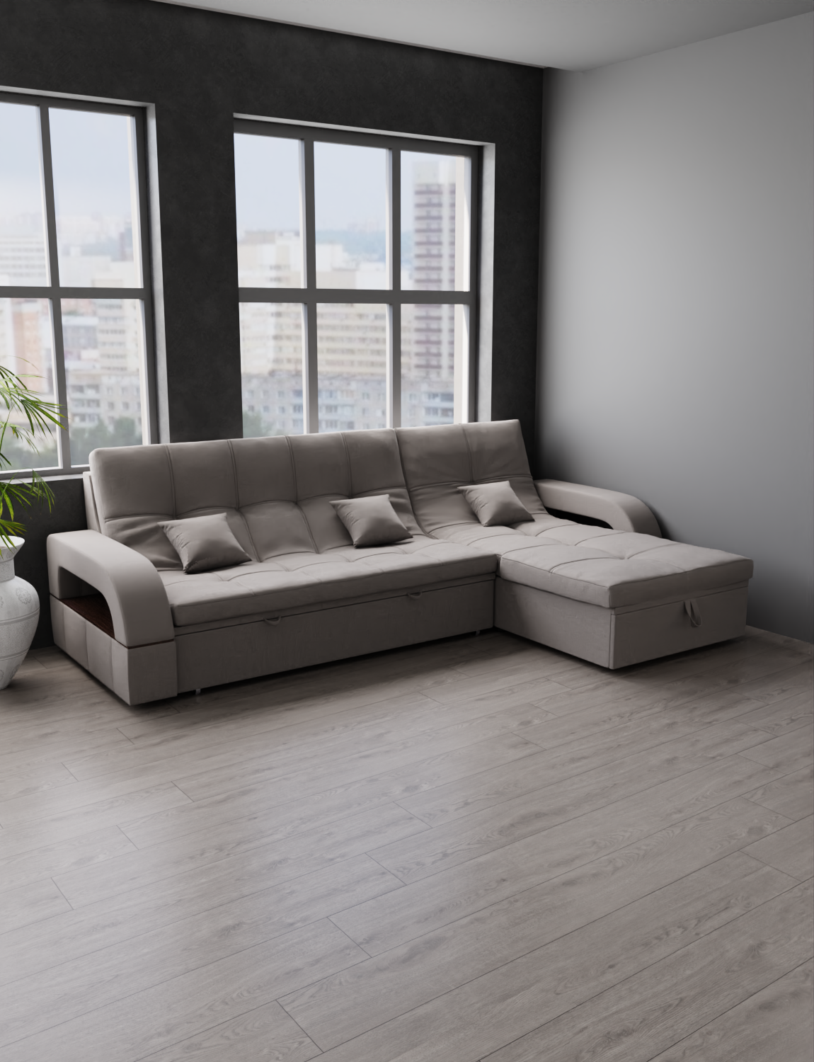 Он имеет высоту 97 см, ширину 268 см и глубину 175 см. Диван обладает универсальным расположением угла, что позволяет его использовать в любом помещении.